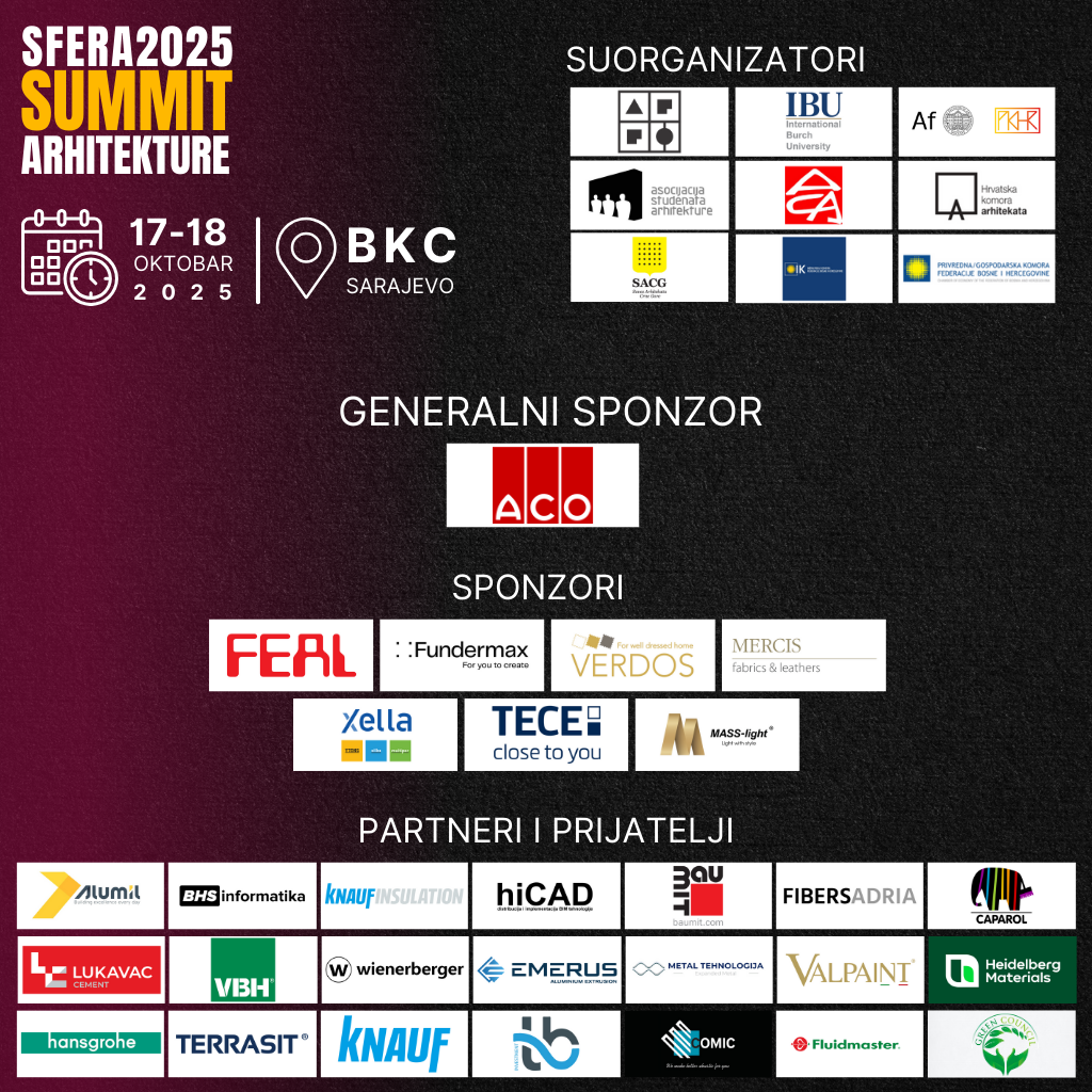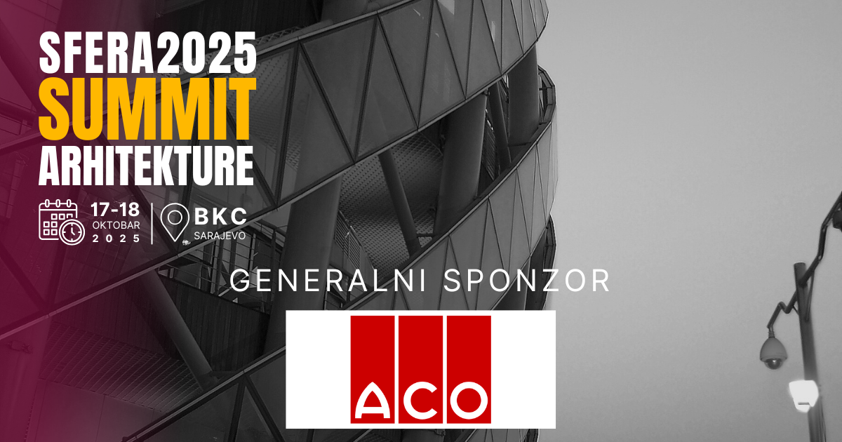 ACO Grupa jedan je od lidera na svjetskom tržištu po proizvodnji sistema za površinsku odvodnju. Svojim integrisanim pristupom ACO se zalaže za profesionalnu odvodnju, ekonomično prečišćavanje, te kontrolisano ispuštanje i ponovno korištenje vode. ACO nudi rješenja nove generacije za upravljanje površinskim vodama koja kontrolišu tok vode od njenog prihvata i odvodnje, do prečišćavanja, zadržavanja i kontrolisanog ispuštanja u prirodnu sredinu, kako bi se ponovo uspostavio prirodan proces kruženja vode. Njihova održiva sistemska rješenja su praktična, ekonomski isplativa, pomažu u upravljanju vodom, te brinu o sigurnosti ljudi i okoline. ACO d.o.o., ponosni je generalni sponzor Regionalnog summita arhitekture Sfera 2025 koji će biti održan 17.-18.10.2025. u BKC (Bosanski kulturni centar) u Sarajevu, BiH. Na ovome prestižnom događaju, Aco će predstaviti novitete i inovacije, pružiti sve neophodne informacije, savjete i preporuke, te se i na ovaj način pozicionirati u regiji, ali i svijetu kao lider.