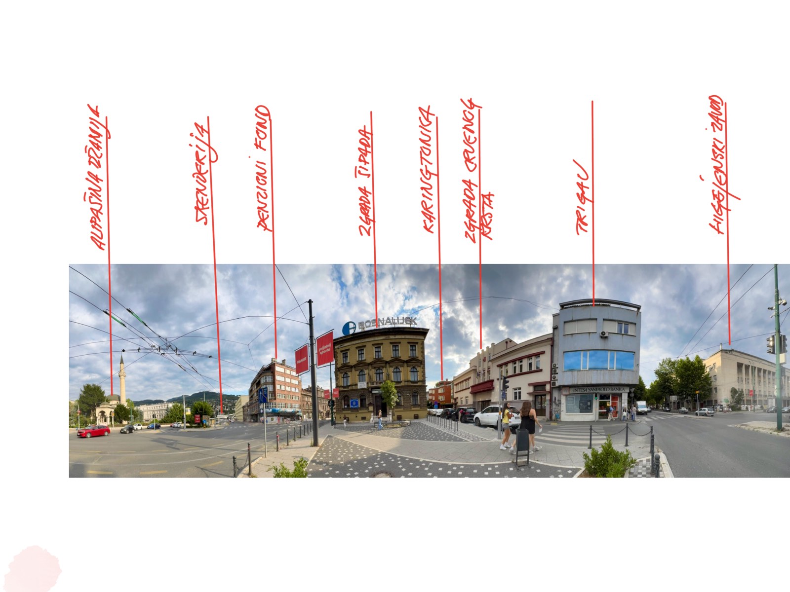 Grad se ne pravi da bude stroj, nego da bude živa neuronska mreža raznih značenja, gdje se stari i novi slojevi stapaju i tvore analogije. Sarajevo je upravo to. Stanite na raskrsnicu ulica Titove i Alipašine, na onaj mali trg ispred nekada jedne od upravnih zgrada velikog Šipada, danas poznate po ordinaciji Bičakčić i okrenite se oko sebe. Ta raskrsnica je izložba na otvorenom. Stalna izložba arhitektonskih zdanja kao svjedoka vremena. Na tom mjestu kao u nekoj tematskoj izložbi antologije “ o ideologijama koje su formirale ovaj grad “ gdje je vrijeme kao neki kustos “, stavilo jednu naspram druge. Stoljeća se tu čitaju na jednom pointu grada. Alipašina džamija koja je izgrađena 1560 godine je biser među potkupolnim džamijama. Ona svojom proporcijom, skladom, govori koliko se može biti monumentalan kada imaš mjeru. Koliko je istinska arhitektura estetski doživljaj. Ona svjedoči o velikom znanju tog vremena u kojem je nastala. Nasuprot nje, dijagonalno je ugaona kuća iz Austro -Ugarskog perioda. Začetak jednog bloka, to je zgrada koja je sakrivala Hastahnu -bolnicu iz osmanskog perioda, koju je trebalo izgleda srušiti, jer je ova sadašnja zgrada, znak i početak stambenog bloka koji se nije dogodio. Tako je razmišljala ta druga imperija zapadnog karaktera koja je uticala na formu grada. Ona nije neki izuzetan arhitektonski izraz, ali kao početna ugaona kuća neostvarenog bloka, ona je svjedok tog momenta razvoja grada. Odmah do nje je zgrada Crvenog Krsta – Helena Baltasara – jedan od prvih primjera moderne izgrarđena 1929 godine.