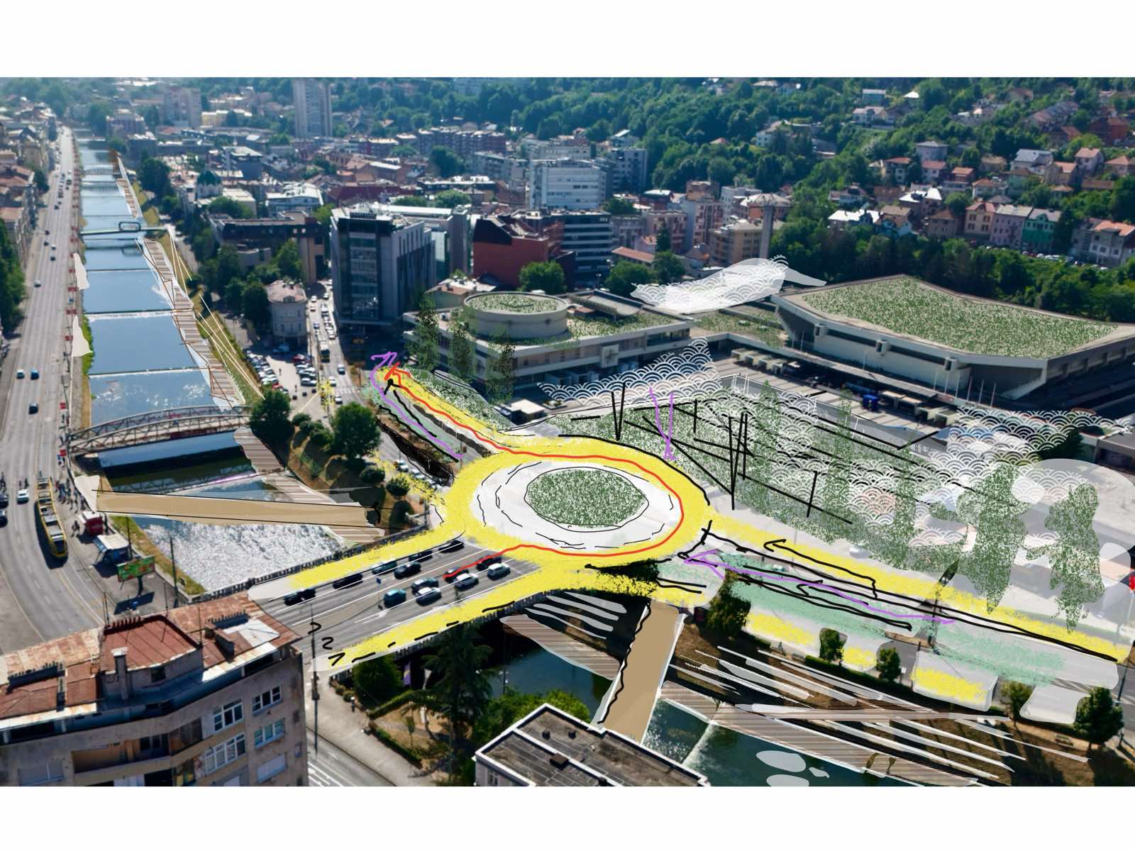 Ono što bi bilo radikalno i na čemu treba insistirati, jer je lako izvodljivo , je formiranje šetnice uz Miljacku u nivou rijeke. Nepravedno zapostavljena rijeka Miljacka, koja se svojim koritom koji je opravdan, odvojila od grada. Ona je bitna za definiciju grada.