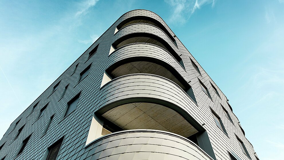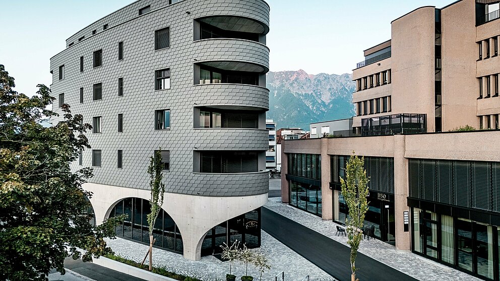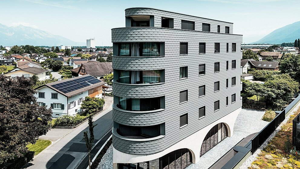 Novogradnja kombinira čvrstu masivnu konstrukciju s izuzetnim vizuelnim utiskom. Dijelom zbog zgrade bez uglova u trokutastom obliku, a dijelom zbog njene „ljuskaste reptilske kože“ od sitnih PREFA zidnih šindra u P.10 svijetlosivoj boji, koja ravnomjerno obavija zgradu i čini je pravim vizuelnim naglaskom. Još bolja odluka, jer zahvaljujući formatu šindra mogu se postaviti i na uske radijuse, što omogućava zaobljene uglove. „Neposredno iza naše zgrade počinju tradicionalne švicarske porodične kuće, a one su kod nas obložene šindrom“, objašnjava Keller svoju kreativnu odluku u dizajnu.