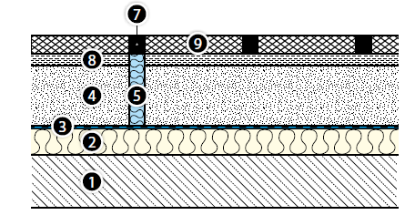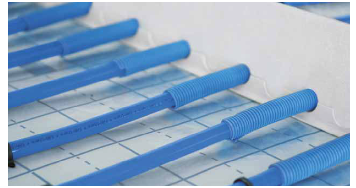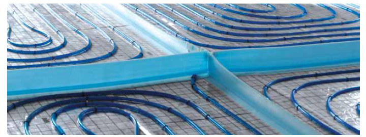 4. Tranzitne cjevovode koji opskrbljuju pojedinačne zavojnice, a koji moraju prelaziti dilatacijski razmak, treba zaštititi od oštećenja postavljanjem unutar posebnih dilatacijskih profila, koji su izrađeni od trake od pjenastog PE, profilirane šine i cijevi za oblaganje duljine 40 cm (krajevi tih cijevi trebaju biti zaštićeni od prodiranja tekućeg estriha).