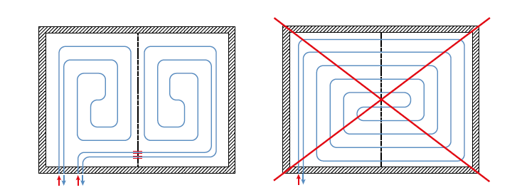 Raspored podnih ploča za grijanje treba uzeti u obzir u tehničkom projektu. Razmak (minimalne širine 5 mm) mora odvajati estrih ploče od cijele debljine susjedne ploče, počevši od toplinske izolacije do pokrovnog sloja.