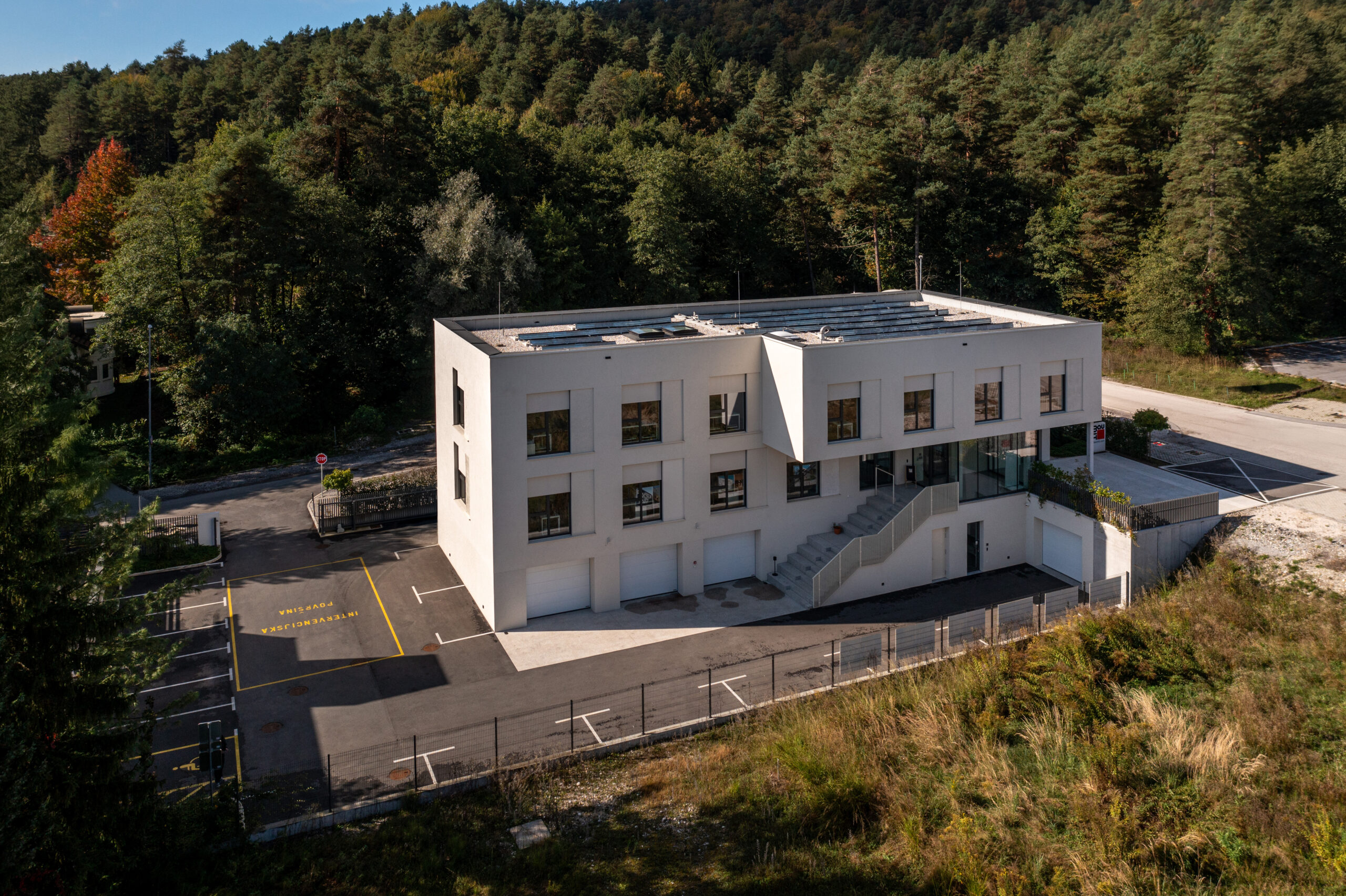 „Nalazimo se na ivici industrijske zone, a jedna od ključnih smjernica u dizajnu zgrade bila je upravo ta lokacija – jer zona završava šumom, što nam je omogućilo da otvorimo poglede prema vani, prema šumi i prirodi, i da povežemo unutrašnji i vanjski prostor“, objašnjava arhitekta Anže Koren.