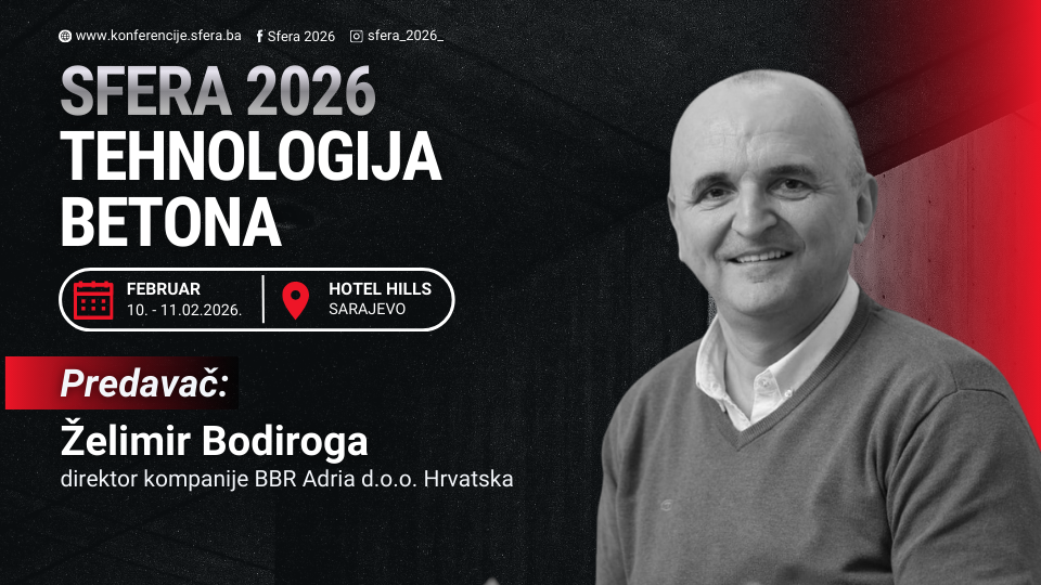 Regionalna naučno stručna konferencija i sajam o temi ”Sfera 2026: Tehnologija betona” održat će se 10. i 11.02.2026. godine u Sarajevu, Hotel Hills.