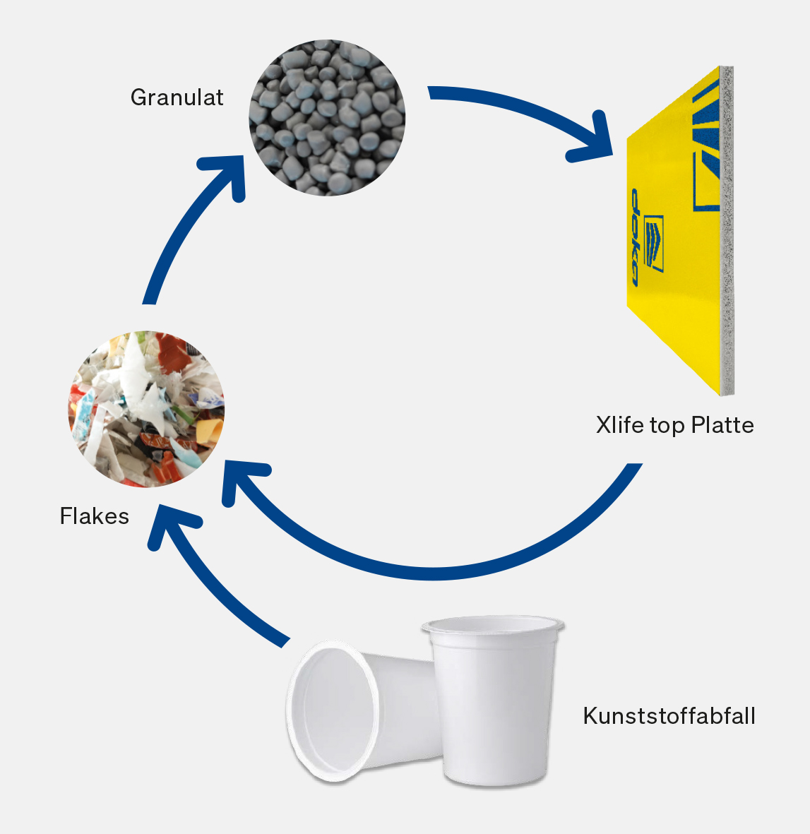 S pločom Xlife top Doka uspješno prenosi koncept zatvorenog kruga recikliranja u rješenje industrijskih razmjera. Jezgra ploče izrađena je od materijala koji sadrži 100 % recikliranu plastiku. Na kraju životnog ciklusa Doka može preuzeti rabljene ploče i u cijelosti ih vratiti u proizvodni ciklus („princip zatvorenog kruga“). Zahvaljujući dugom vijeku trajanja, nova ploča Xlife top ima znatno manji ugljični otisak u usporedbi s klasičnim drveno-kompozitnim pločama.