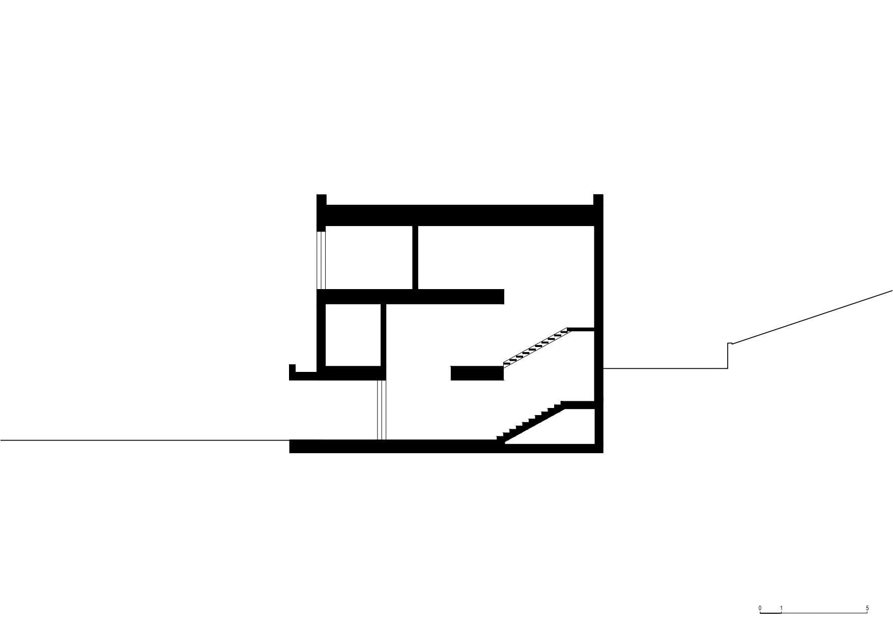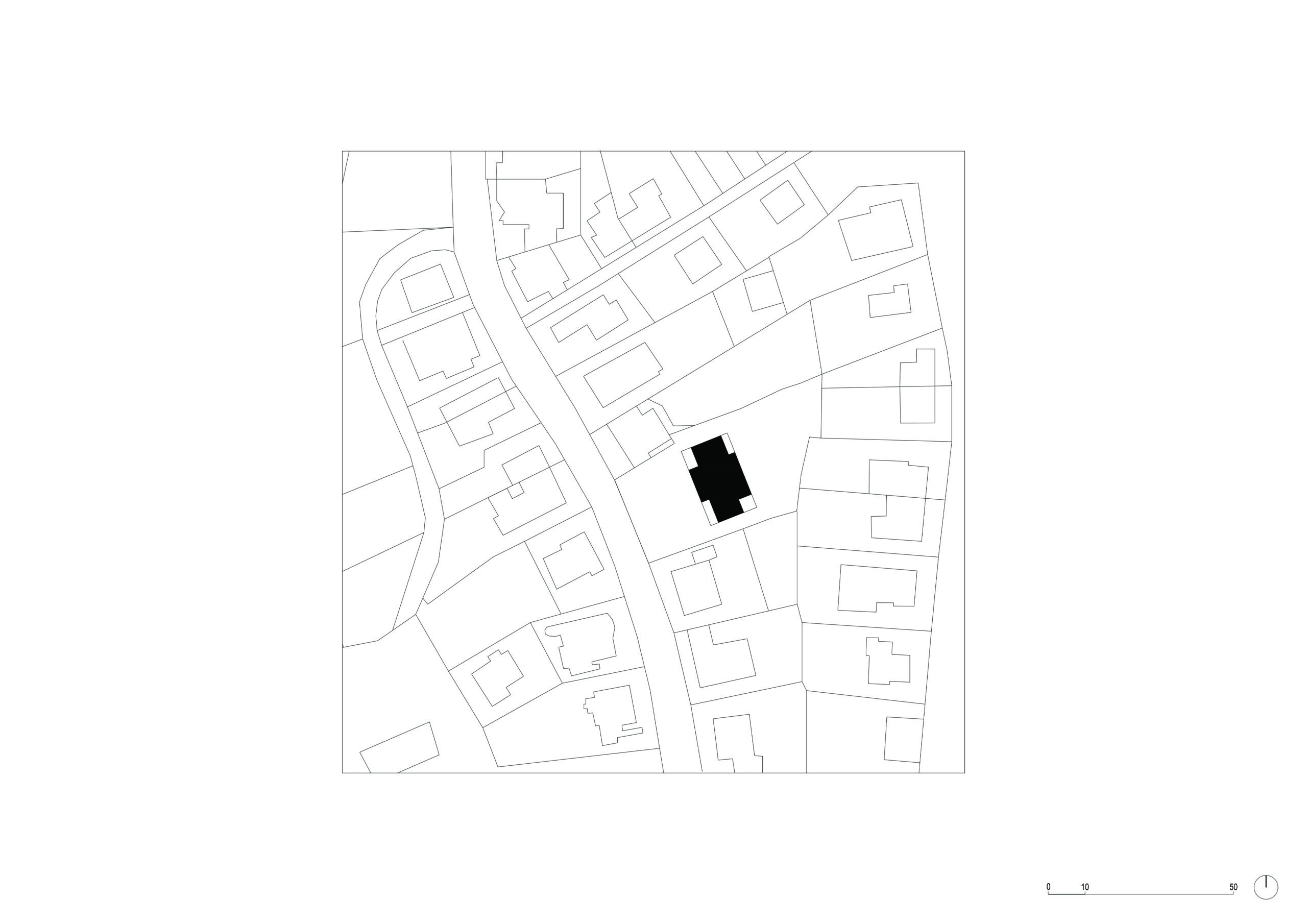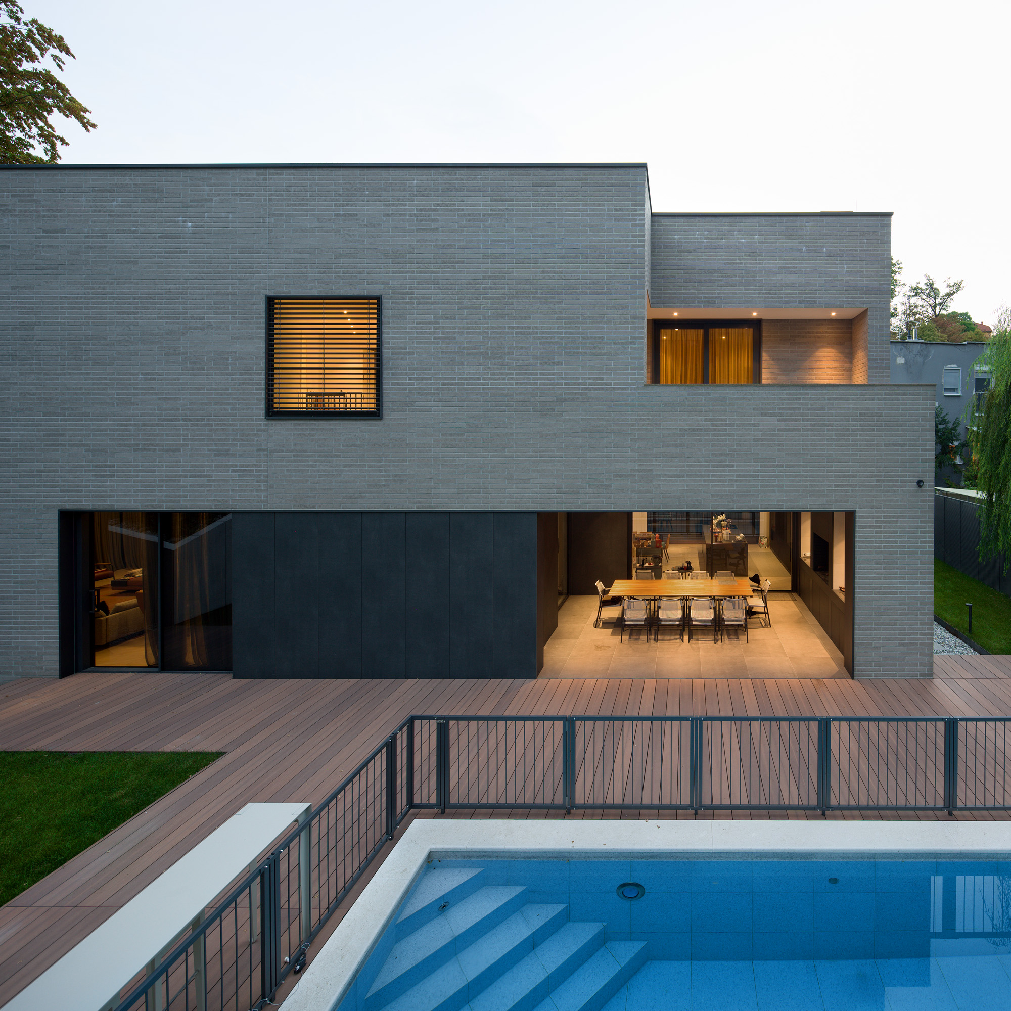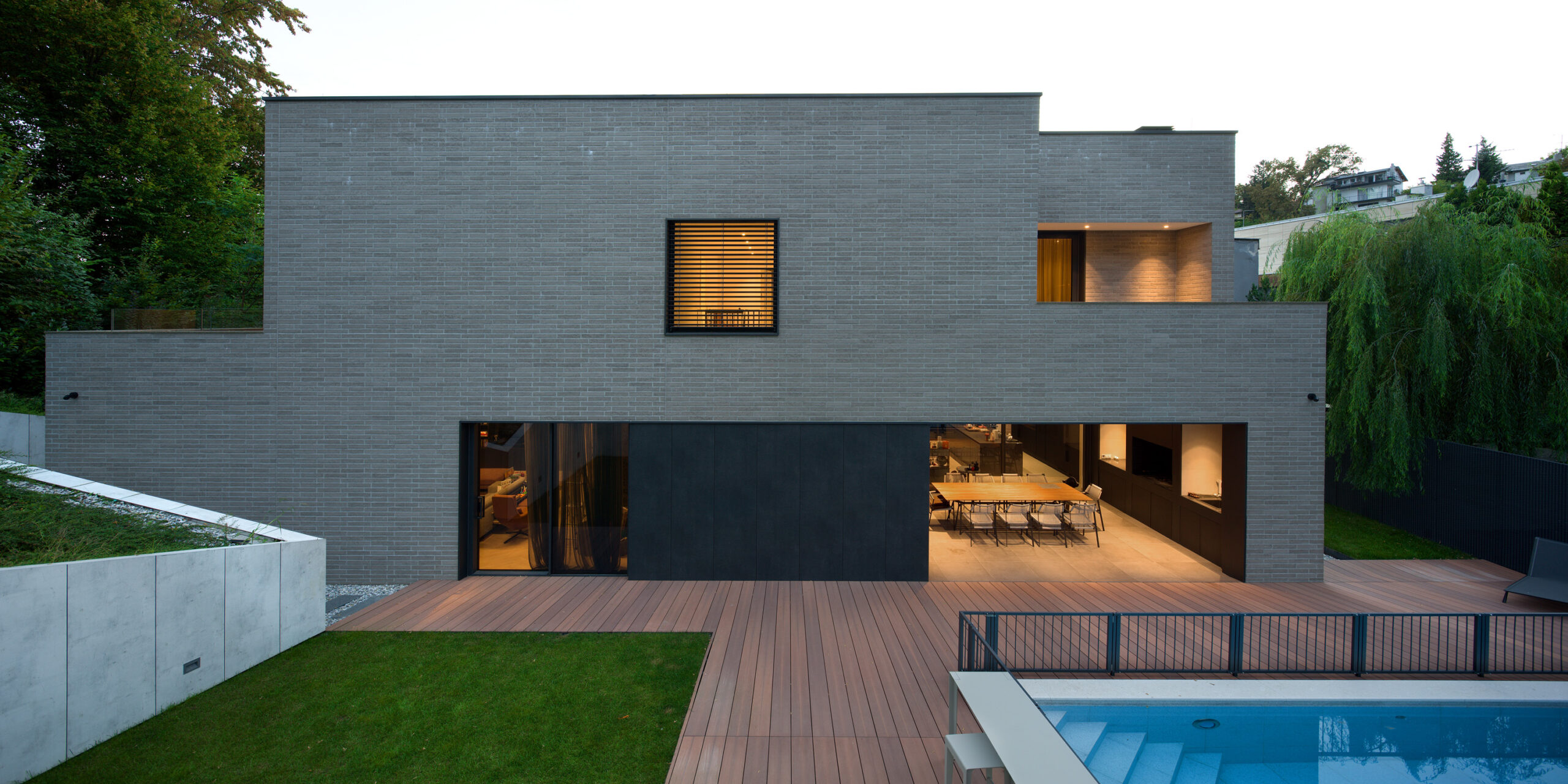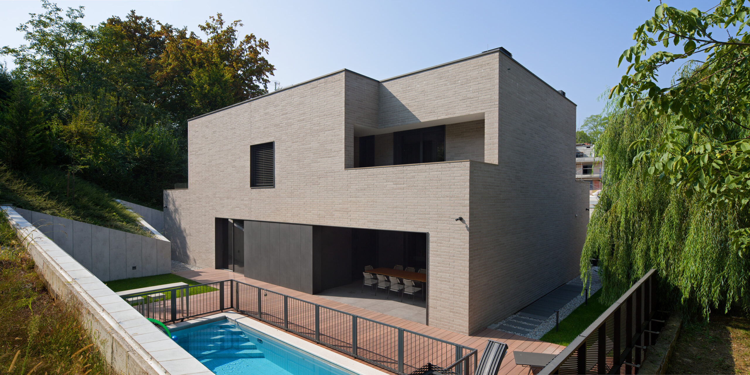 Na strmom terenu, uz usječenu i vijugavu ulicu elitne zagrebačke četvrti samostojećih obiteljskih kuća, arhitekti formiraju pauzu u strogom ritmu ulice povlačeći se s građevnog pravca susjednih zgrada u dubinu parcele. Svijetu razigranih, često narativnih oblika, materijala i krovova ulice suprotstavljaju naglašeno suzdržanu arhitekturu kuće. Ona je kvadar od opeke izdignut na platformu.