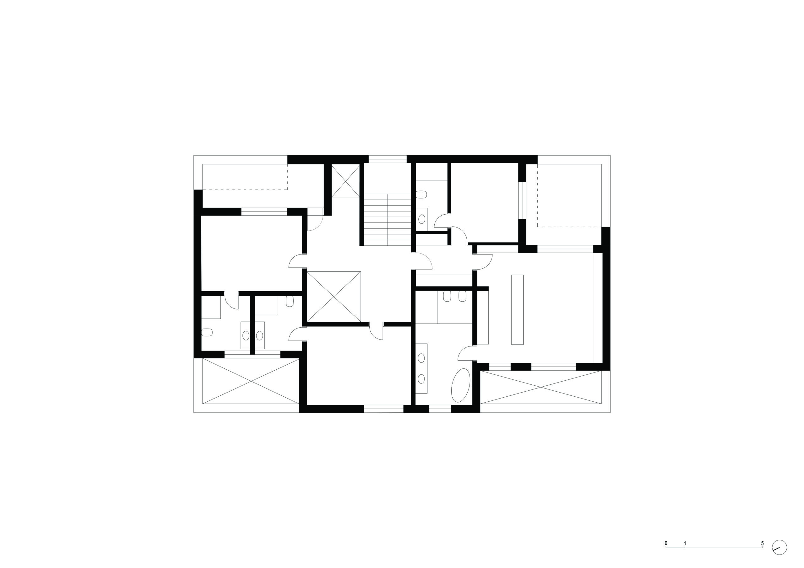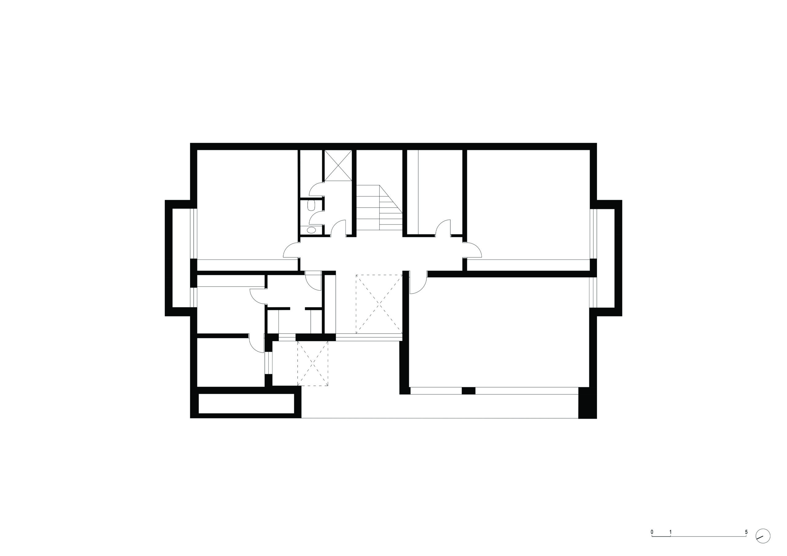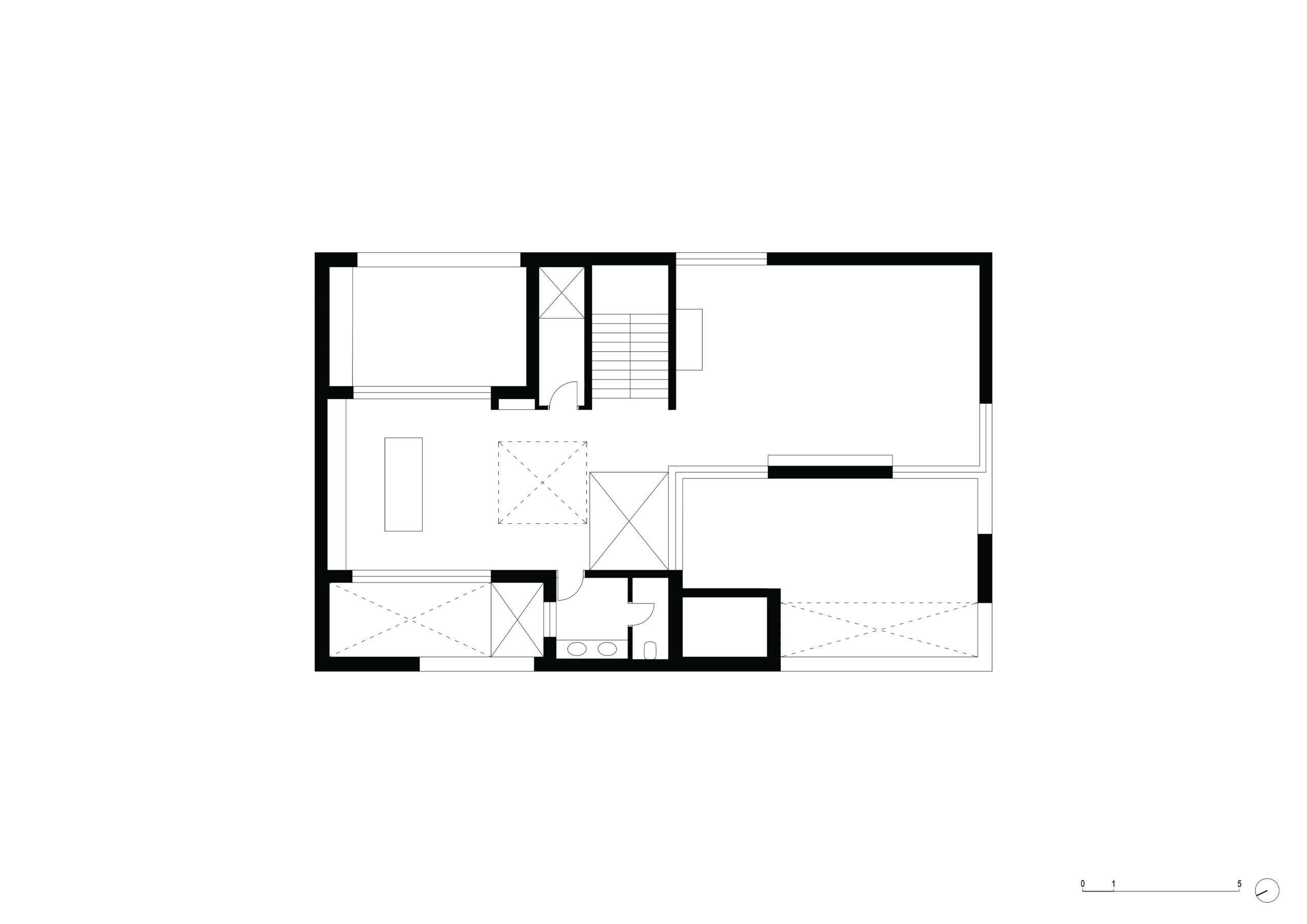 Sva složenost projekta proizlazi isključivo iz procesa oduzimanja od toga jednostavnog početka: oduzimanja izvana i iznutra. Oduzimanje izvana formira zapadne lođe zajedničkih prostora kuće prema ulici i istočne terase spavaćih soba prema parceli, istovremeno artikulirajući veliki volumen kuće u mjerilu ulice. Platforma na kojoj se kuća nalazi sadrži vanjske ekstenzije zajedničkog prizemlja i vješto ugrađuje dio bogatog programa kuće u suterenu odvajajući pritom strmi vrt iza od dvorišta ispred. Oduzimanje iznutra stvara okosnicu projekta: trodimenzionalnu šupljinu koja se proteže kroz presjek od suterena do krova te u tlocrtu između sva četiri pročelja.