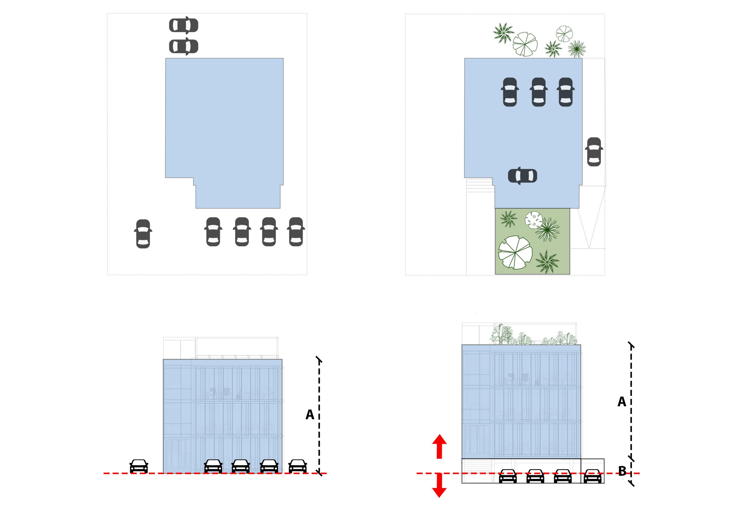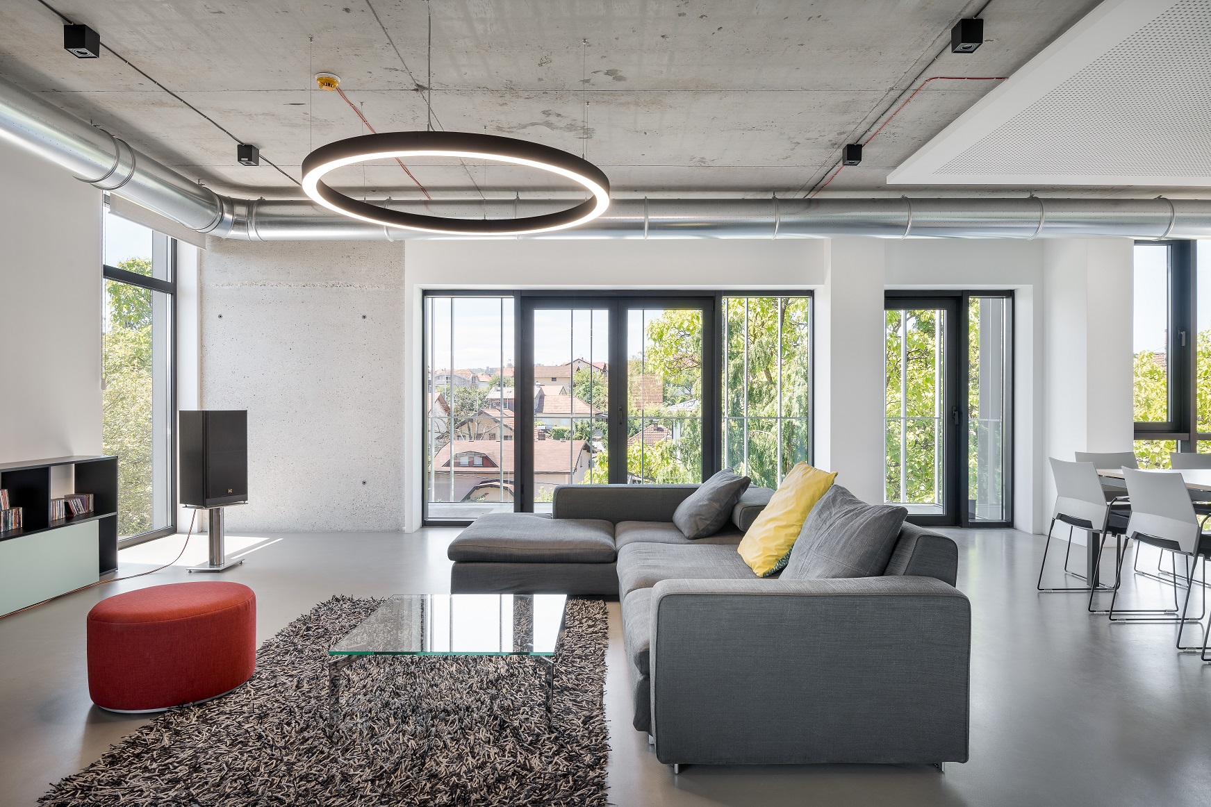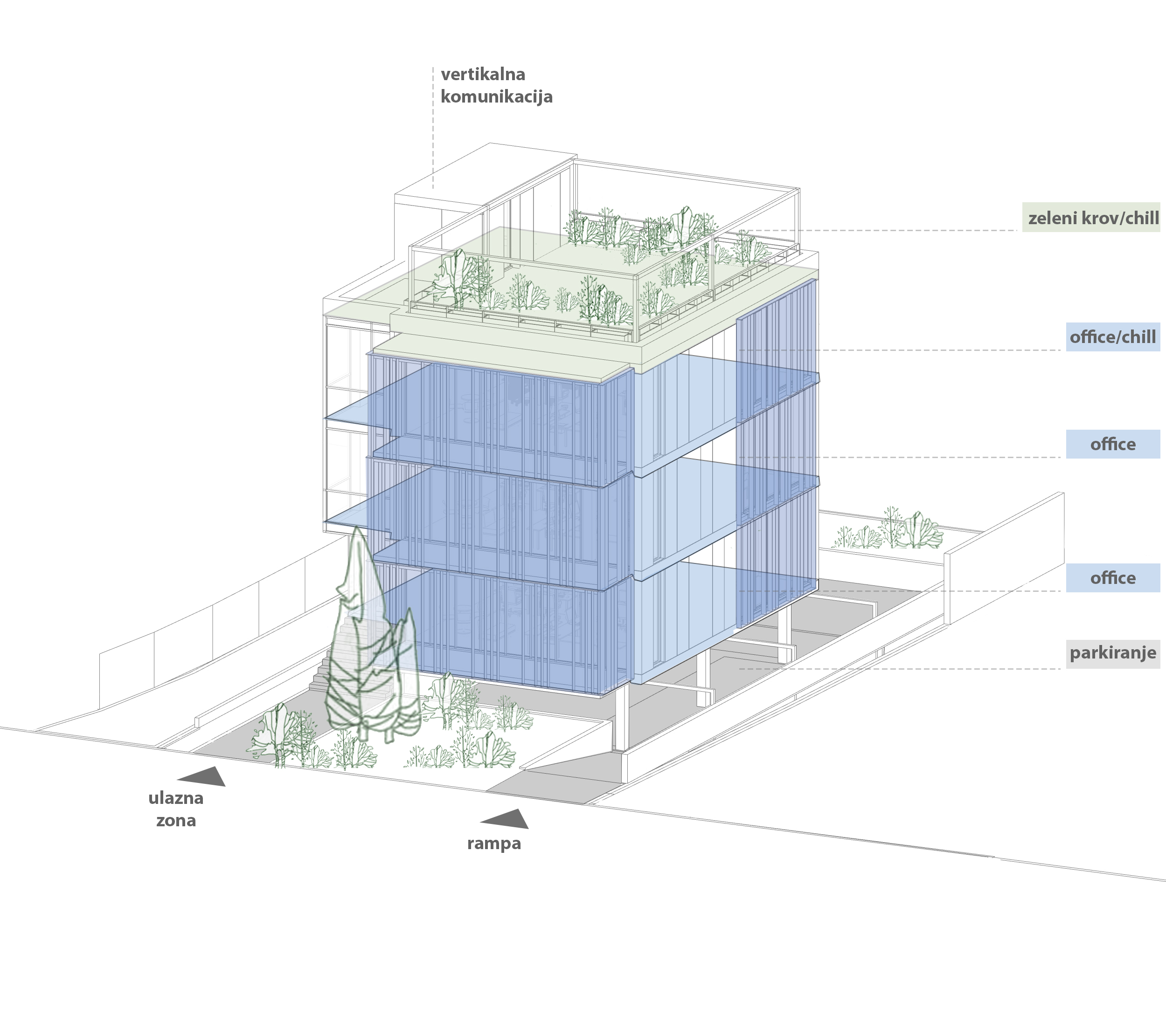 Na predmetnoj lokaciji postojala su dva objekta lošeg bonitetnog stanja, individualni stambeni i pomoćni objekat, a kroz projektni zadatak zahtijevala se promjena funkcije stanovanja u poslovanje. Pri tome je akcenat bio na očuvanju i planiranju dodatnog zelenila, oko i na objektu. Ideja je da se premještanjem prostora za parkiranje sa prizemlja u suteren omogući ozelenjavanje partera, a projektovanjem vertikalnih fiksnih sjenila sa zapadne strane objekta, na terasama, omogućeni su uslovi za dalje ozelenjavanje. Na taj način izgradnjom objekta nisu narušene ambijentalne vrijednosti lokacije i unaprijeđen je vizuelni identitet prostora. Pješački i kolski pristup omogućeni su iz Ulice Kralja Petra II Karađorđevića, pri čemu vozila rampom pristupaju suterenu, a parter sa prednje strane objekta je ozelenjen niskim i visokim rastinjem.