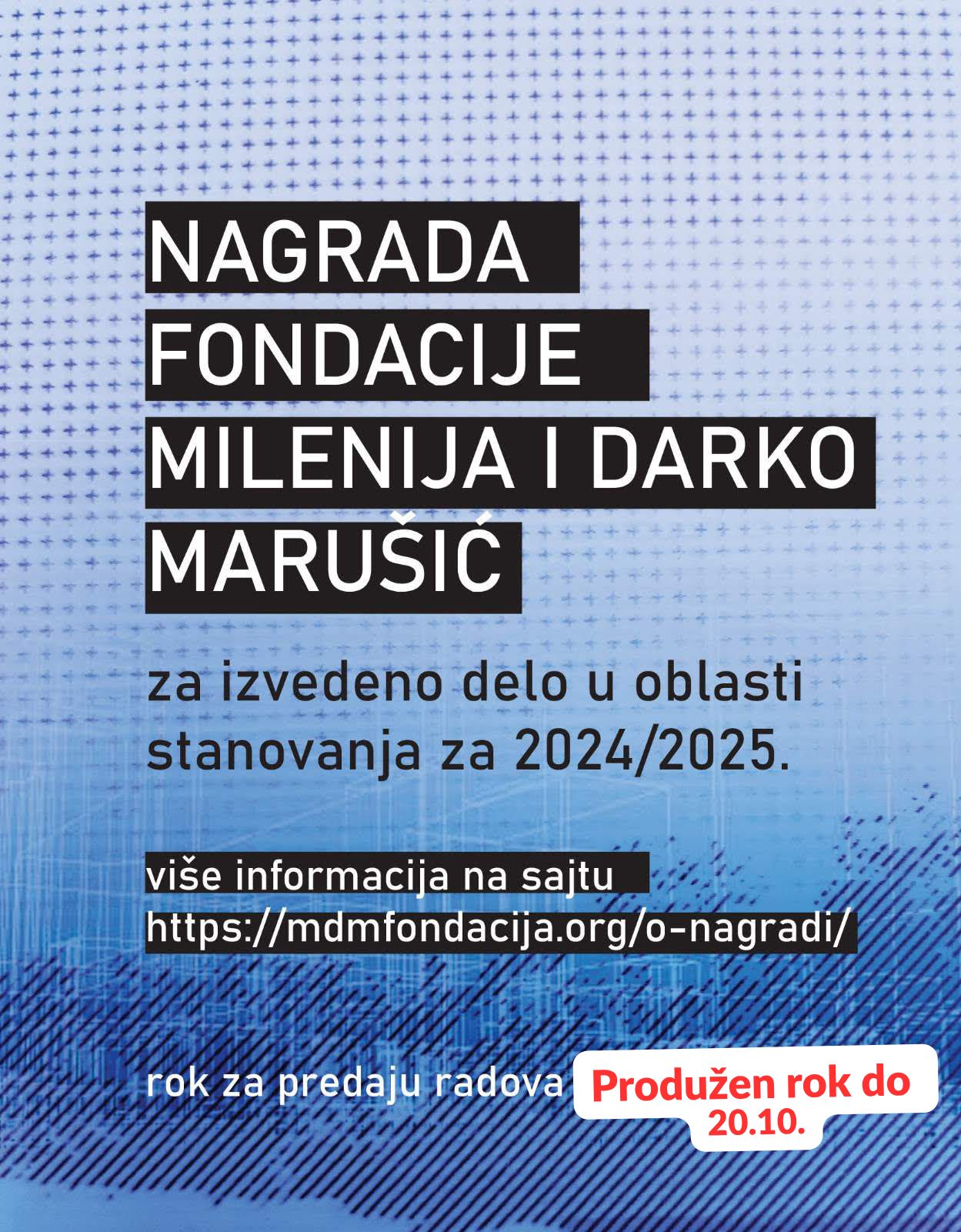 Sa velikim zadovoljstvom, Fondacija „Milenija i Darko Marušić“ (MDM) obavještava javnost da je objavljivanjem pravilnika raspisan konkurs za regionalnu nagradu koja se dodjeljuje za izuzetno stvaralačko djelo realizovano u oblasti arhitekture stanovanja.