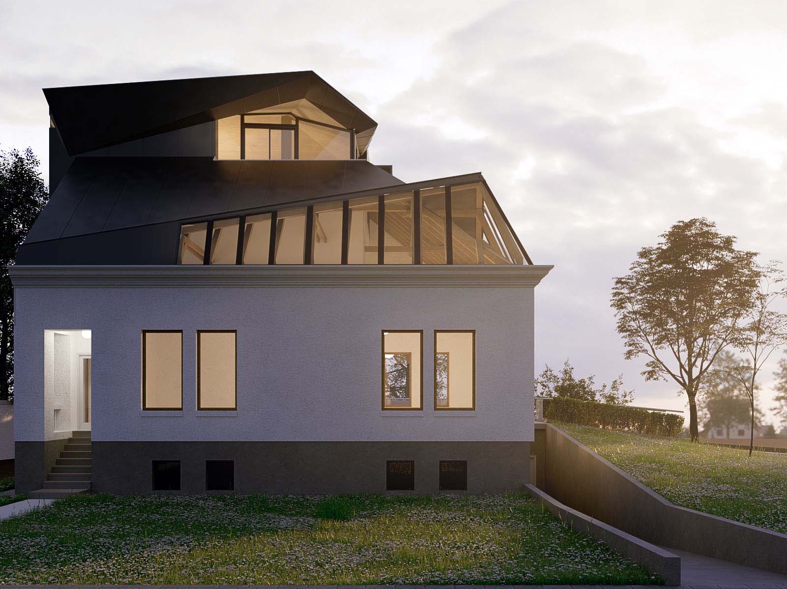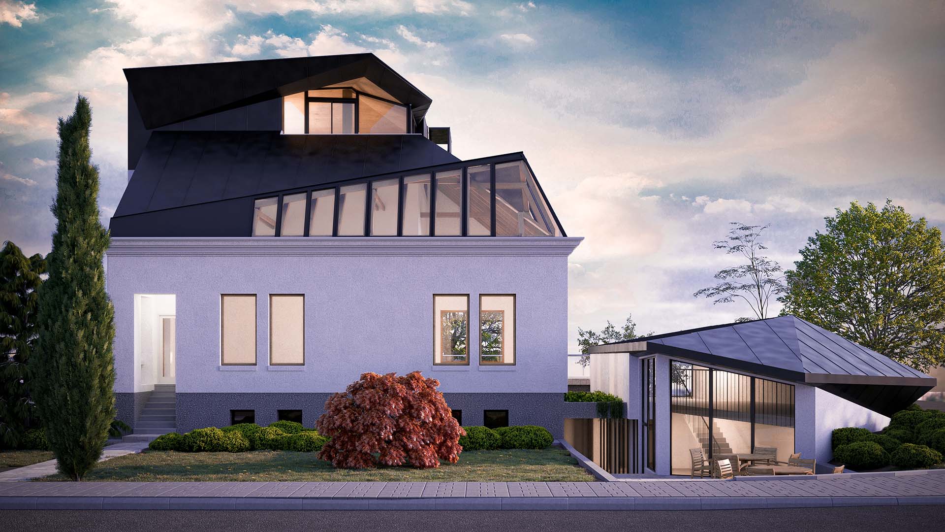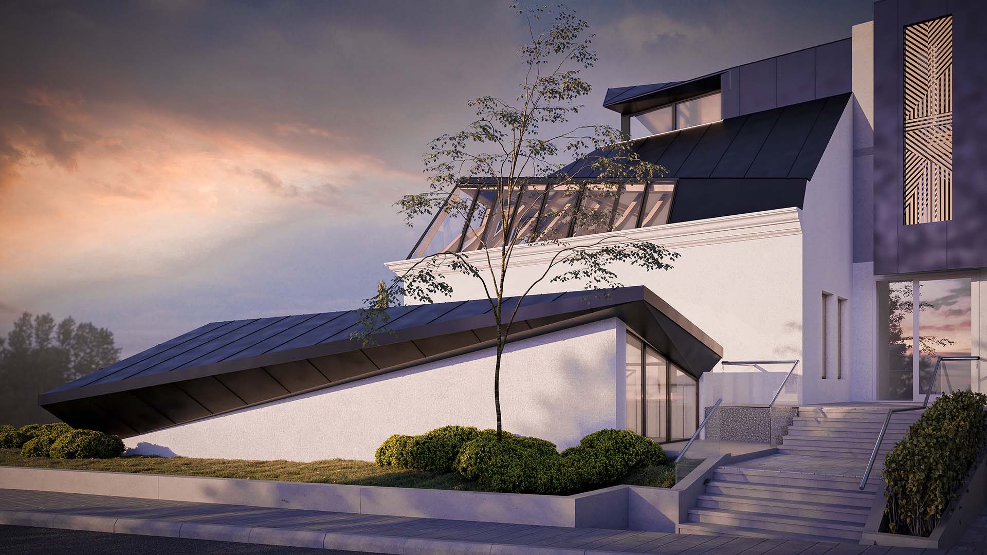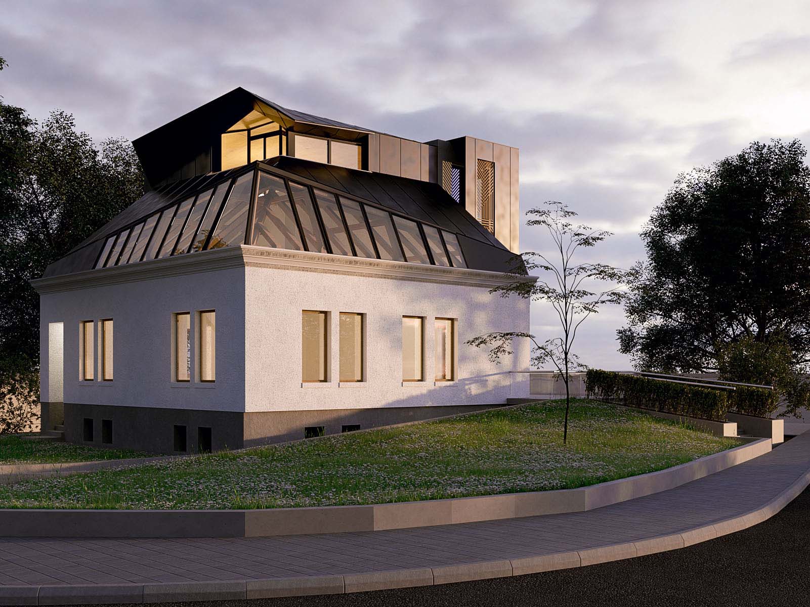 Objektu se dolazi alejom. Primjećujemo ga među stablima, a onda ulazimo u dvorište gdje su velike zelene površine sa obje strane ulaza i dijele ga od javnog prostora naglašavajući privatnost. Jedinstven asketski volumen postojećeg objekta smo uspjeli zadržati bez obzira na promjenu namjene iz porodične kuće za stanovanje u ugostiteljski objekat sa restoranom i sobama za spavanje. On je jednostavno obavezivao na poštovanje. S diskretnim ritmom ploha druge dvije, u prvobitnom projektu manje bitne fasade, istočne i sjeverne, i velikih ostakljenih prozorskih otvora na krovu objekta, te igrom dodatnog prostora u krovnoj etaži promjenjen je eksterijer tako da nije narušena njena autentičnost.