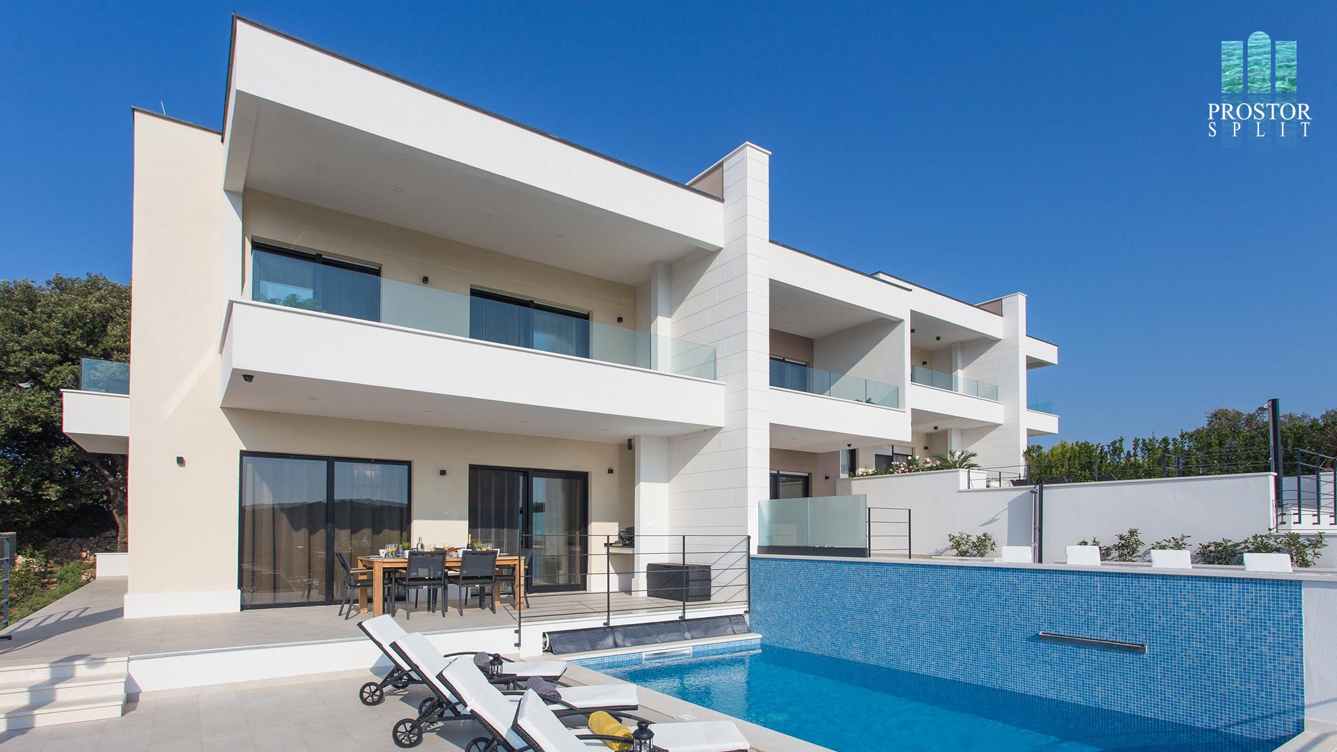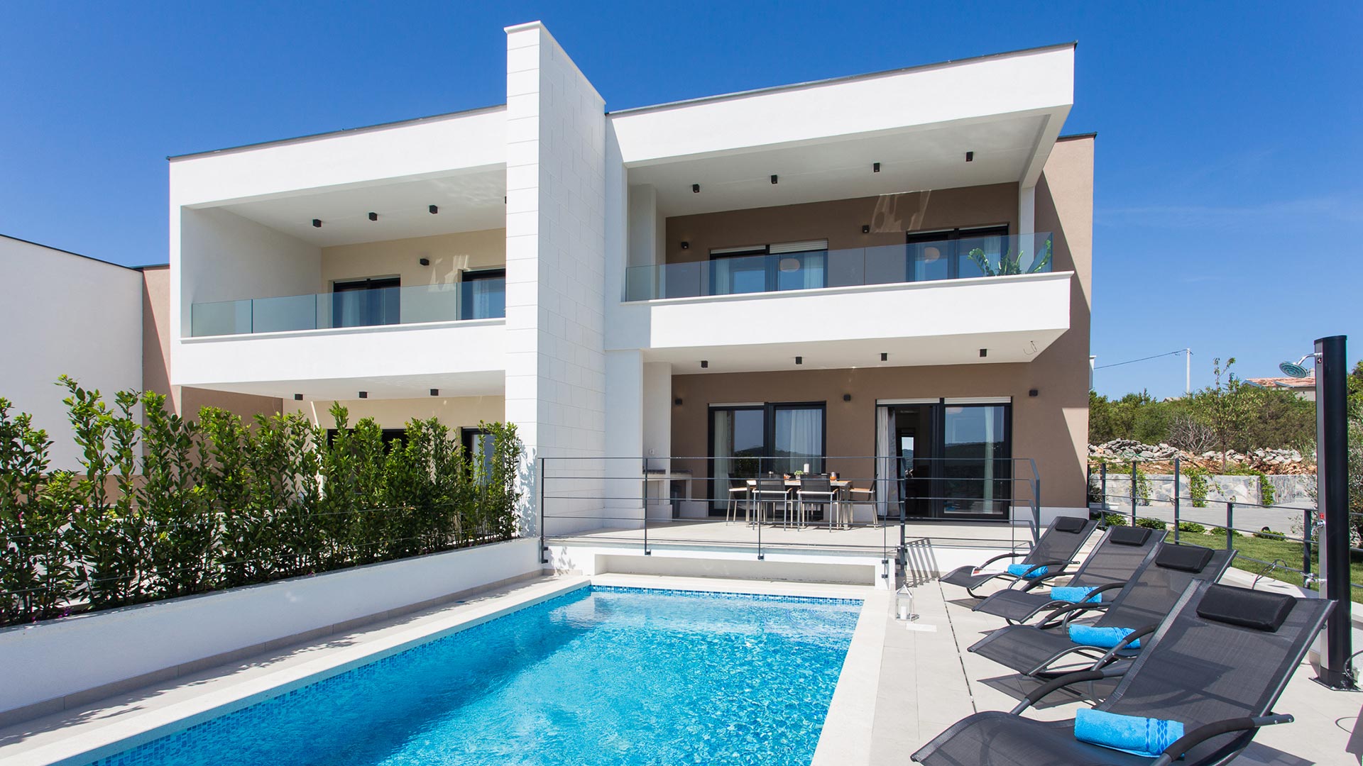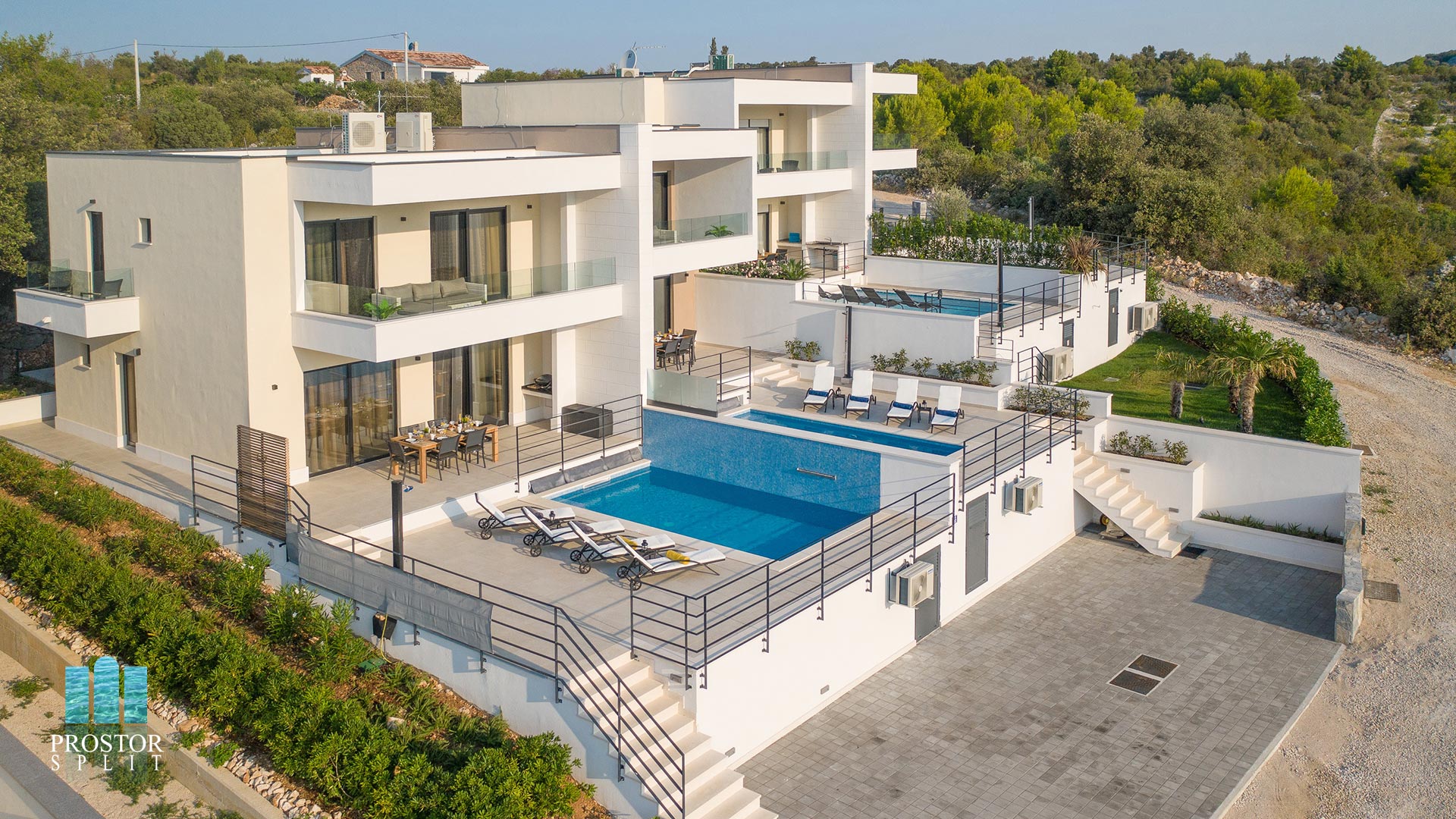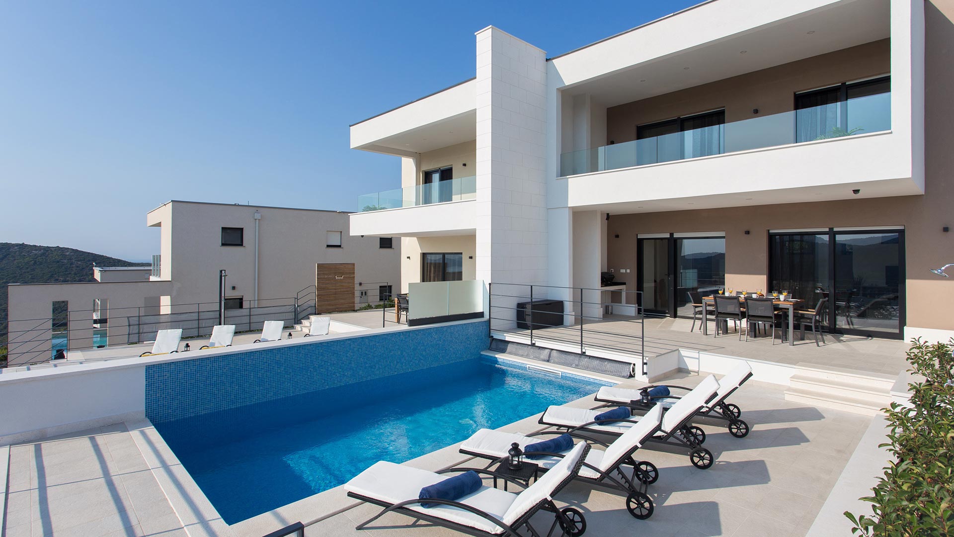 Svaka stambena jedinica ima i bazen na južnoj strani sa pripadajućom sunčalištem, koja je nekoliko stepenica povezana sa vanjskom kuhinjom i blagovaonom. Sa ovih pozicija se pruža prekrasan pogled na zaljev. Parcela je položena uz postojeći put koji prolazi pored parcele sa sjeverne i istočne strane. Parcela je nagnuta, sa nagibom prema jugoistoku, prema moru.