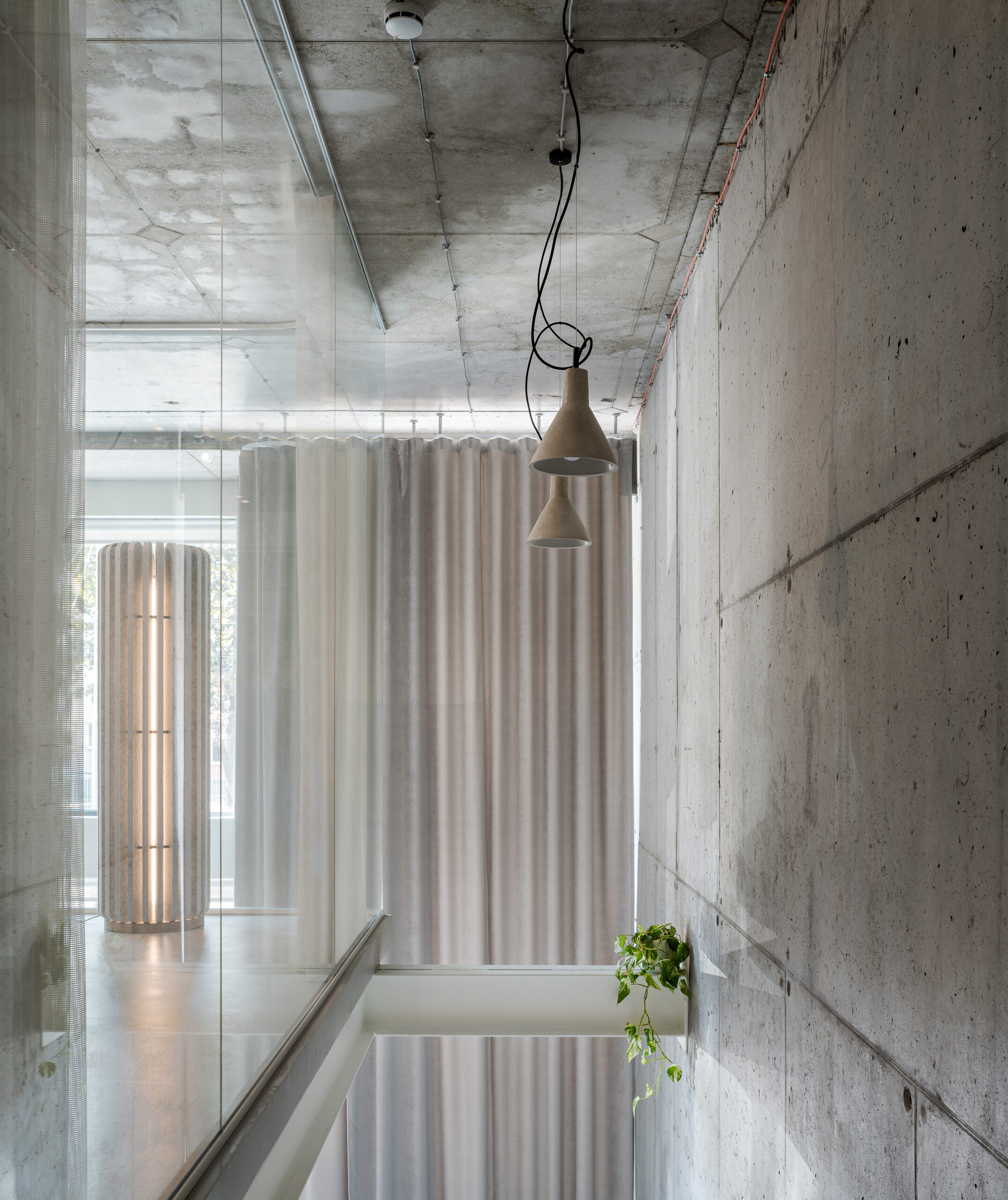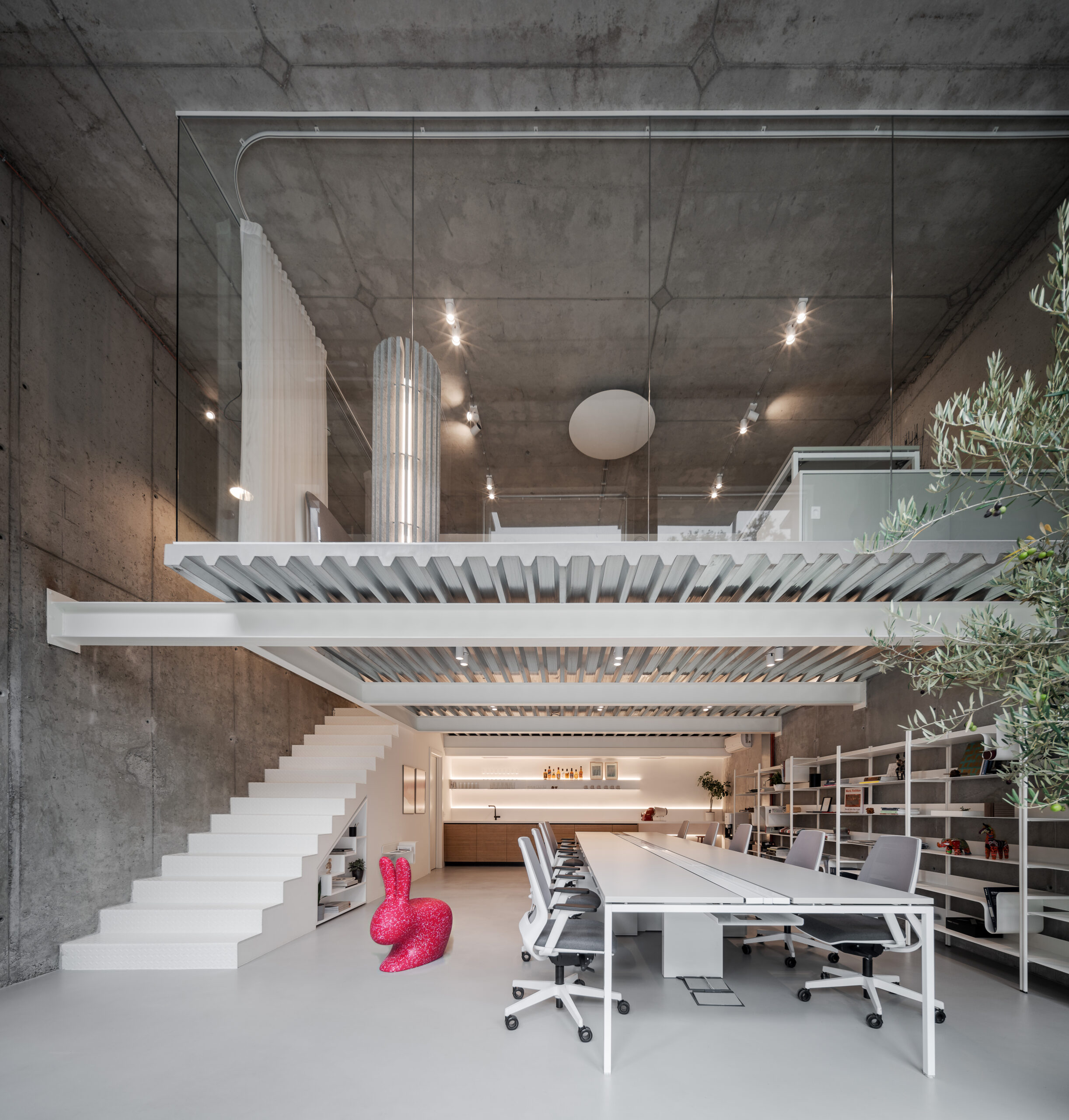 Pri zadržavanju postojećih betonskih površina, odlučili smo se da ne prikrivamo njihovu teksturu, već da ih akcentujemo – one su postale ključni vizuelni element. Osmislili smo čeličnu galeriju napravljenu od masivnih greda i trapezastog lima koji nosi tanku betonsku ploču poda.
