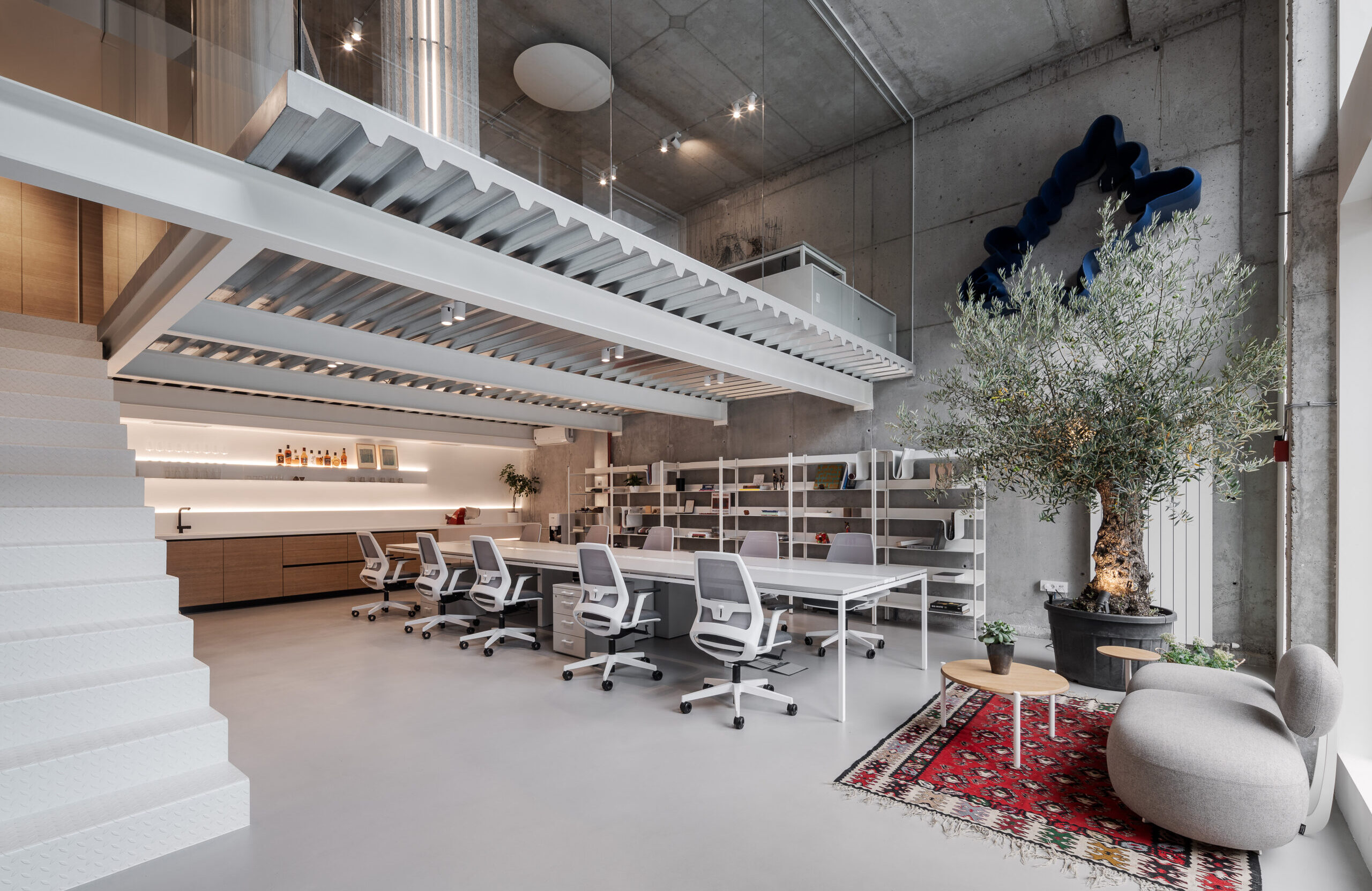 Raspored je osmišljen tako da beton nije samo pozadina, već aktivni učesnik u oblikovanju doživljaja. Galerija koja se uzdiže iznad glavnog radnog prostora, izrađena je u čeliku i betonu, čime smo dodatno naglasili konstrukciju prostora. Klijenti koji nas posjete imaju priliku da dožive ovaj prostor ne kao konvencionalnu kancelariju, već kao kreativnu laboratoriju u kojem se ideje pretaču u formu.