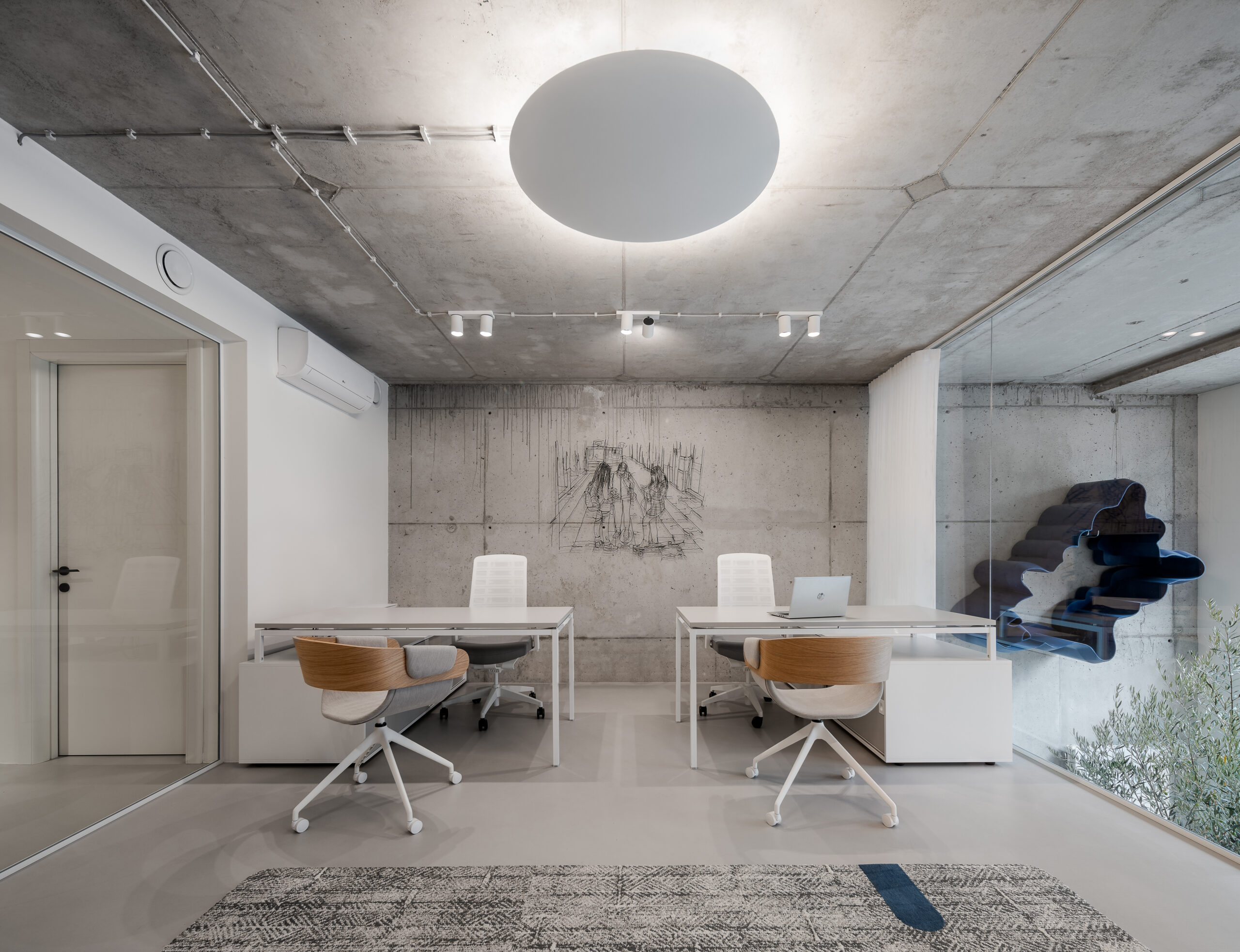 Prelazak u novi prostor za rad predstavlja važnu prekretnicu za svaku firmu i pruža joj jedinstvenu priliku da se predstavi na način koji odražava njene vrijednosti i viziju, bilo da je riječ o internim zaposlenima, klijentima ili čak široj javnosti. Odabrali smo prostor sirove lepote – dvostruke spratne visine, sa golim betonskim zidovima i tavanicama. Upravo je beton, snažan i vizuelno dominantan materijal, postao ključni nosilac izgleda našeg novog radnog prostora. Izazov je bio kako zadržati njegovu sirovost i autentičnost, a istovremeno stvoriti topao, funkcionalan i akustički prijatan prostor za svakodnevni rad.