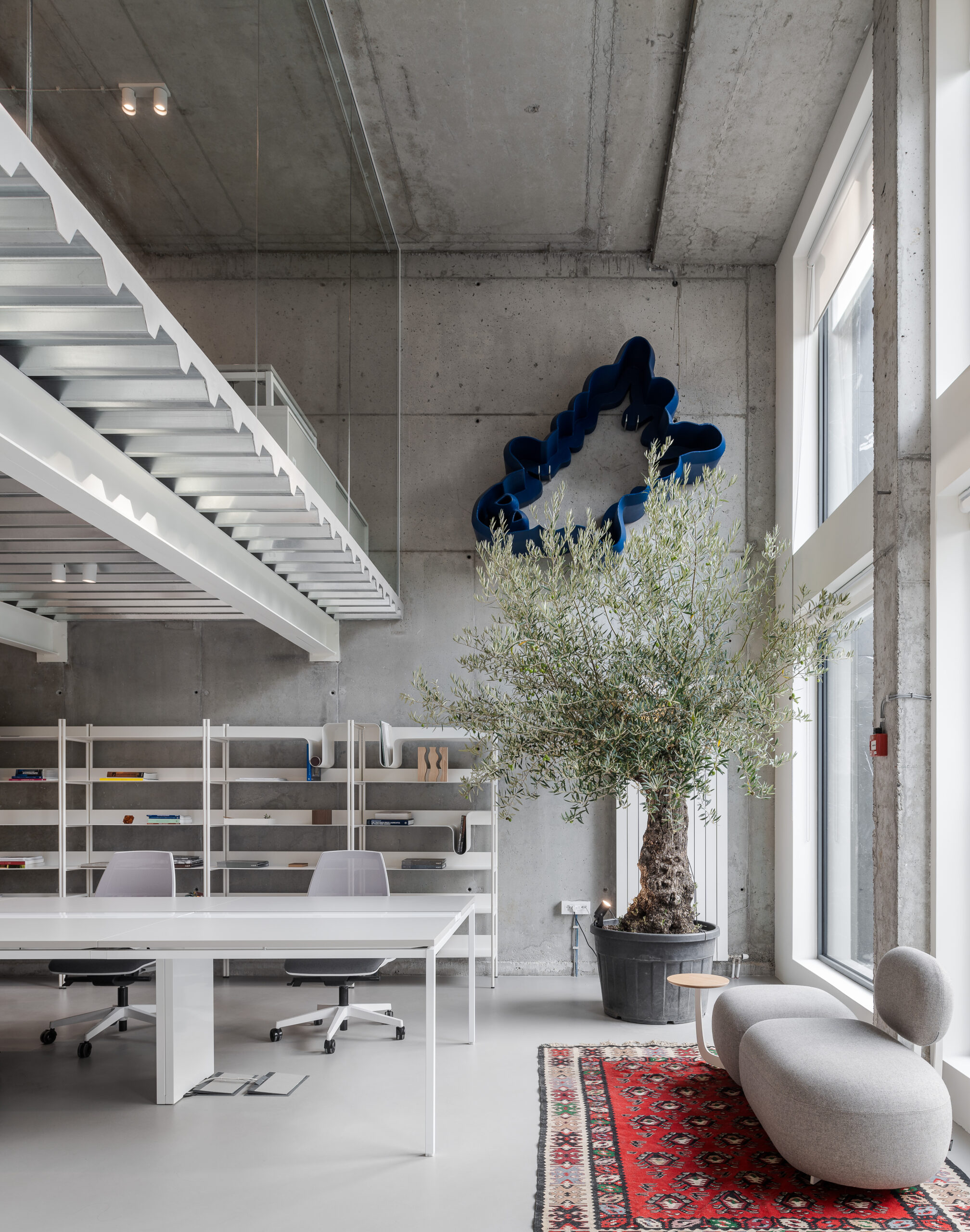 Središnji element – zajednički sto okružen betonskim zidovima – simbolizuje otvorenost i timski duh. Beton kao materijal nudi savršen kontrast fluidnosti kreativnog procesa. On daje čvrstu osnovu, dozvoljavaći idejama da slobodno rastu. Istovremeno, prostori za neformalnu komunikaciju, kao što su kuhinja i lounge prostor, smješteni su tako da prirodno nastave naraciju prostora, bez narušavanja njegove betonske strukture.