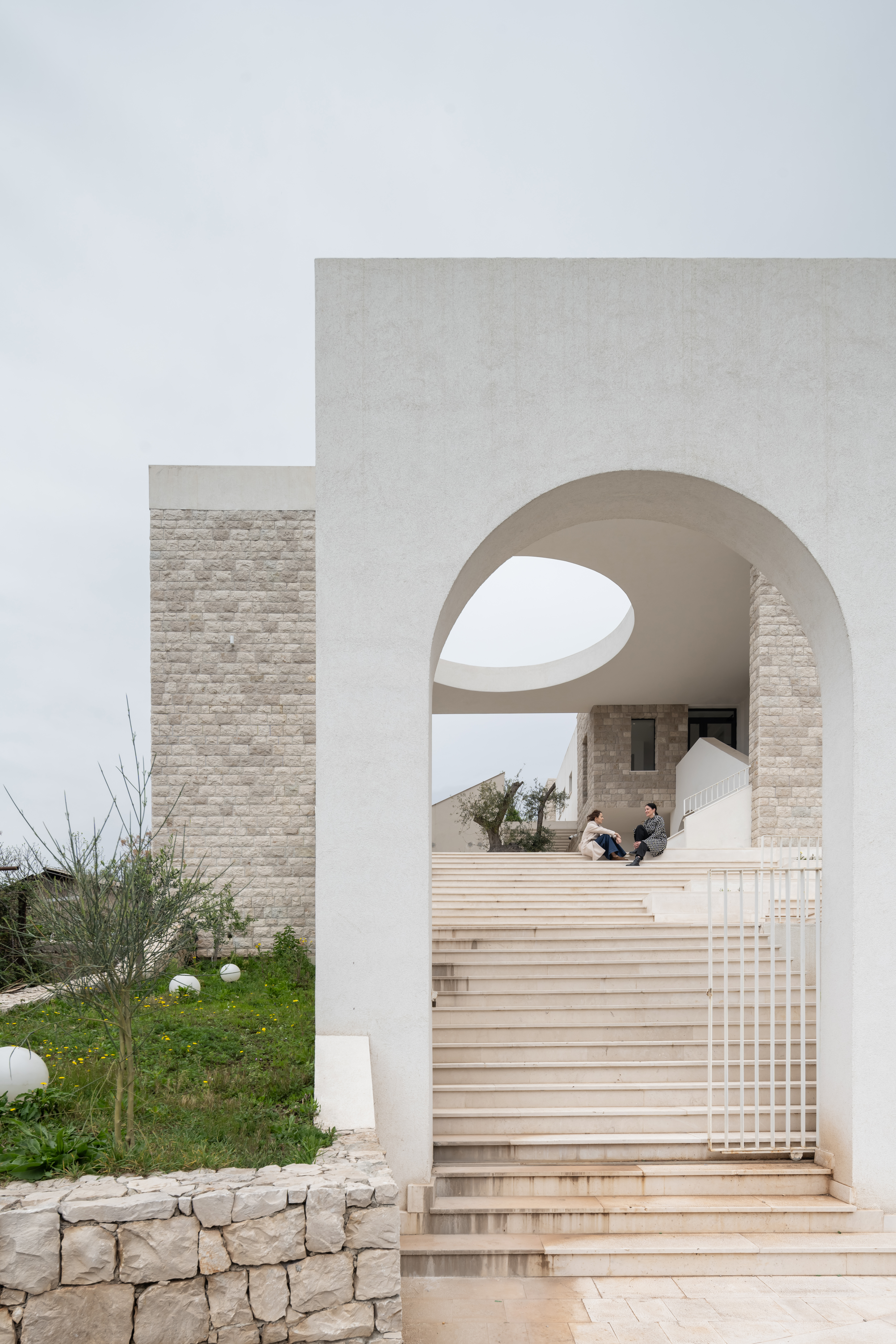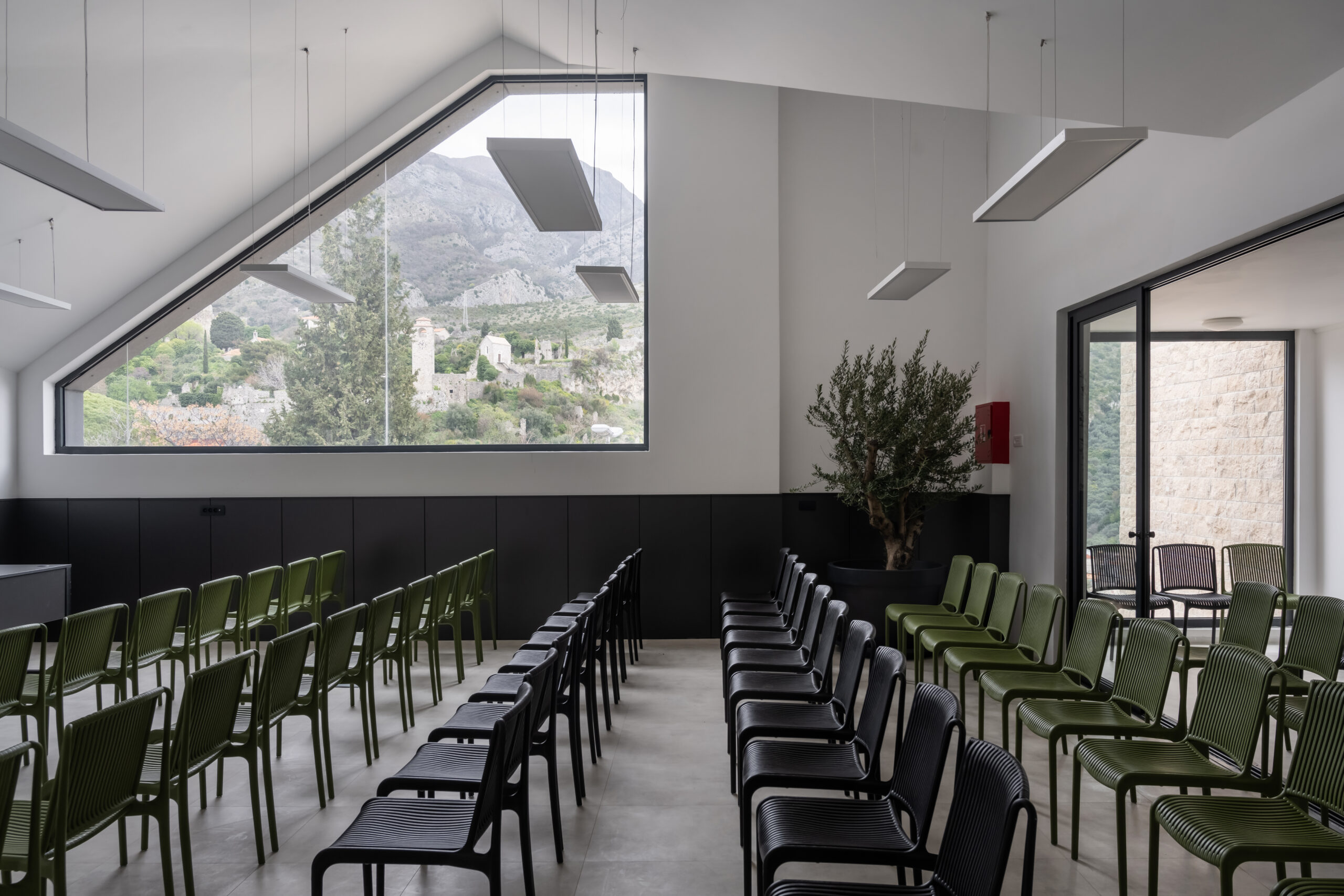 S obzirom na mediteransko podneblje i niz manifestacija koje se dešavaju u okruženju,  vezanih  za dane masline i posjete Starom gradu Baru, dvorištu je posvećena posebna pažnja. Objekat je projektovan kao mali grad sa dvije komunikacije koje se ukrštaju u dvorištu sa maslinom. Ništa nije bilo prirodnije nego da ošupljimo krovnu ploču kako bi maslina uspostavila dijalog sa suncem i nebom. Na taj način smo napravili i omaž ovom svetom drvetu.