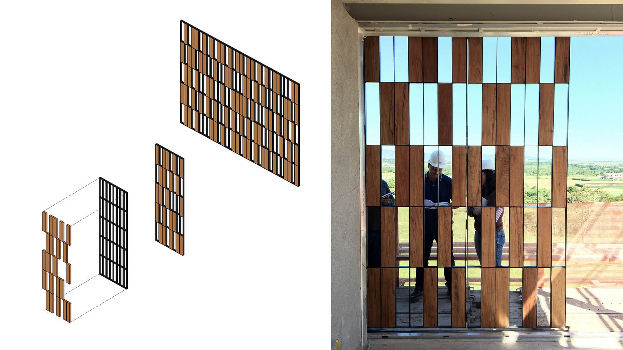 Kuća ima upečatljivu fasadu po meri. Dizajnirana u saradnji sa vlasnicima nekretnina, geometrijski raspoređeni drveni paneli pružaju zaštitu od sunca tokom dana i mogu se podesiti za ventilaciju i privatnost. U međuvremenu, noću, fasada funkcioniše gotovo kao fenjer, bacajući prelepe senke dok istovremeno omogućava da plešuća svetlost prosija.