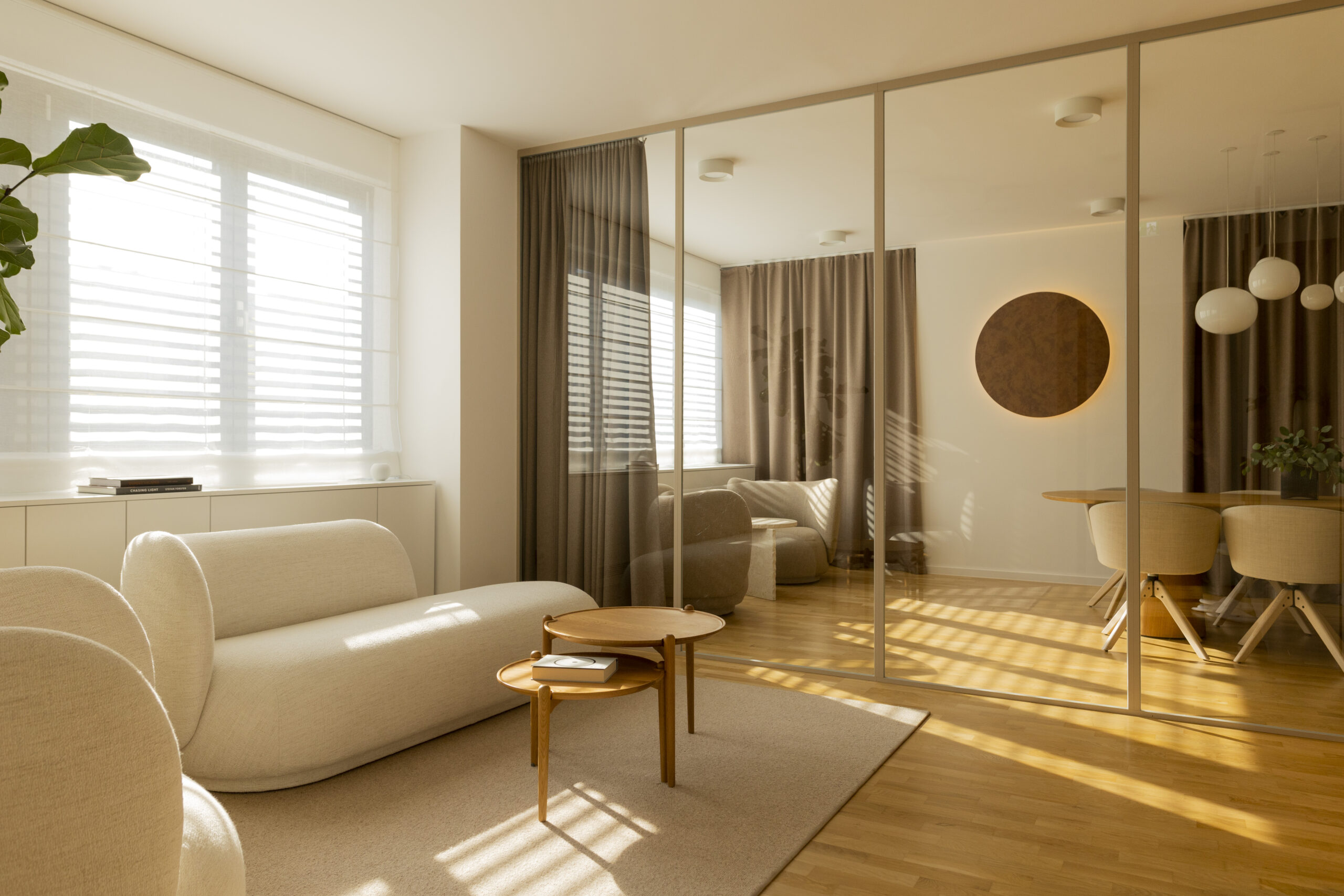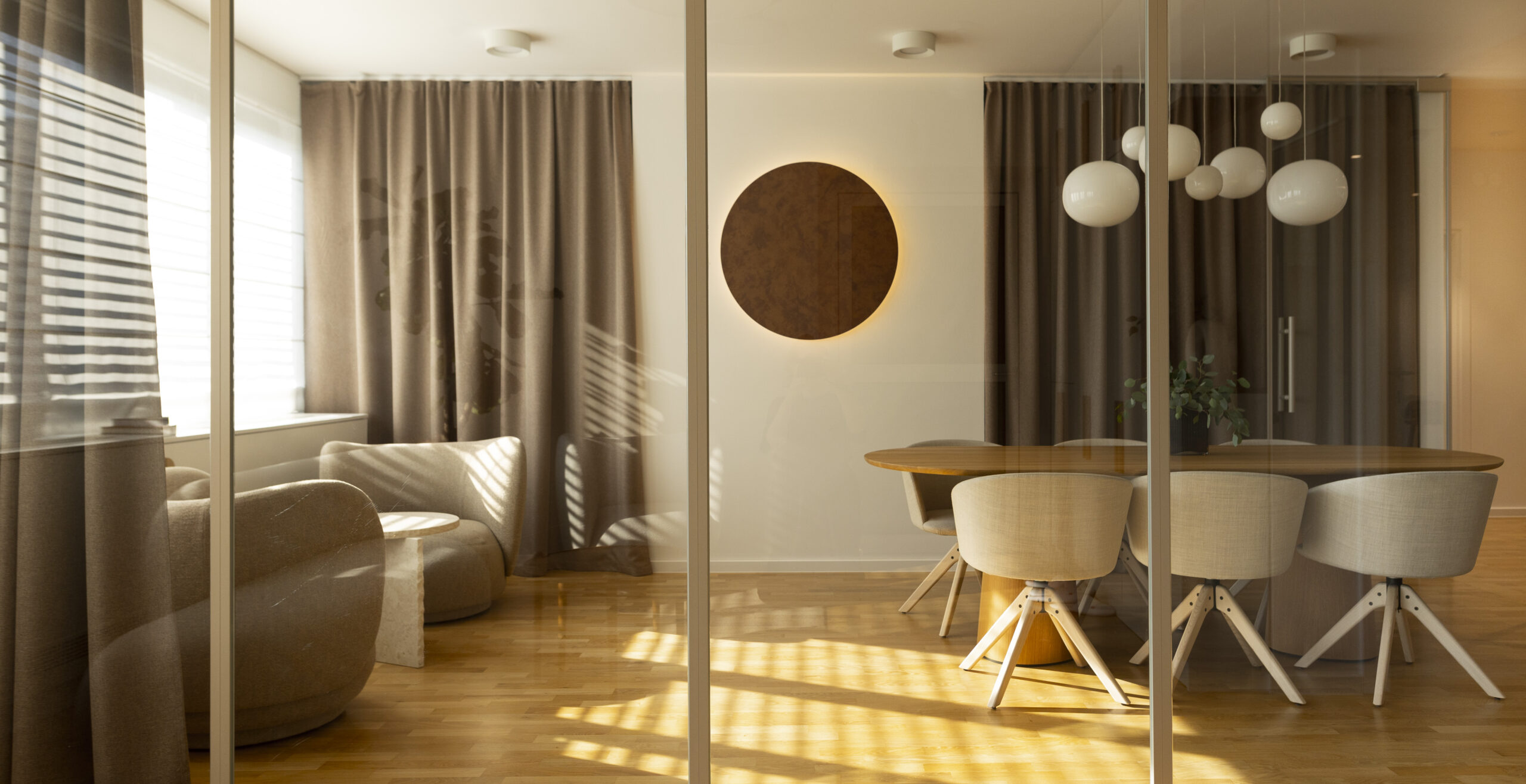 Jedan od ključnih elemenata prostora je i zaobljena staklena stijena, koja je bila izazov u izvedbi jer smo inzistirali na tome da bude podijeljena okvirima. Izvođačima stakla to je bilo nepojmljivo jer su preferirali elegantnu, neprekinutu površinu, no mi smo imali jasnu viziju da upravo taj detalj prati naš koncept i unosi posebnu dinamiku u prostor .