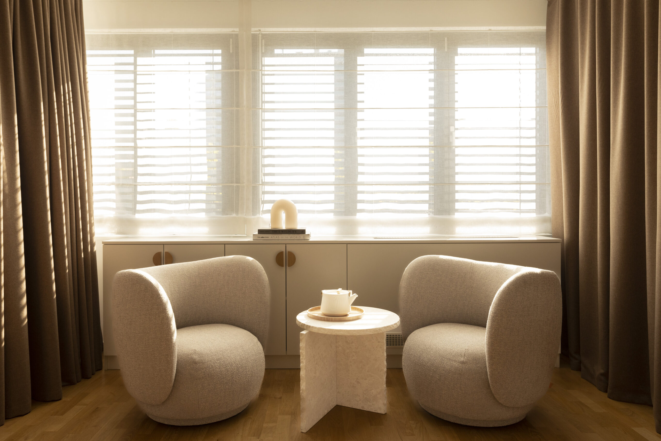 Dizajn ovog ureda odiše pročišćenom estetikom – bez suvišnih dekoracija, ali s izraženim elementima snage i identiteta. Dominiraju svijetli tonovi drva, mekani tapisoni, zaobljeni oblici namještaja i umirujuće nijanse na zidovima. Posebna pažnja posvećena je ergonomiji i taktilnim materijalima koji stvaraju osjećaj ugode.