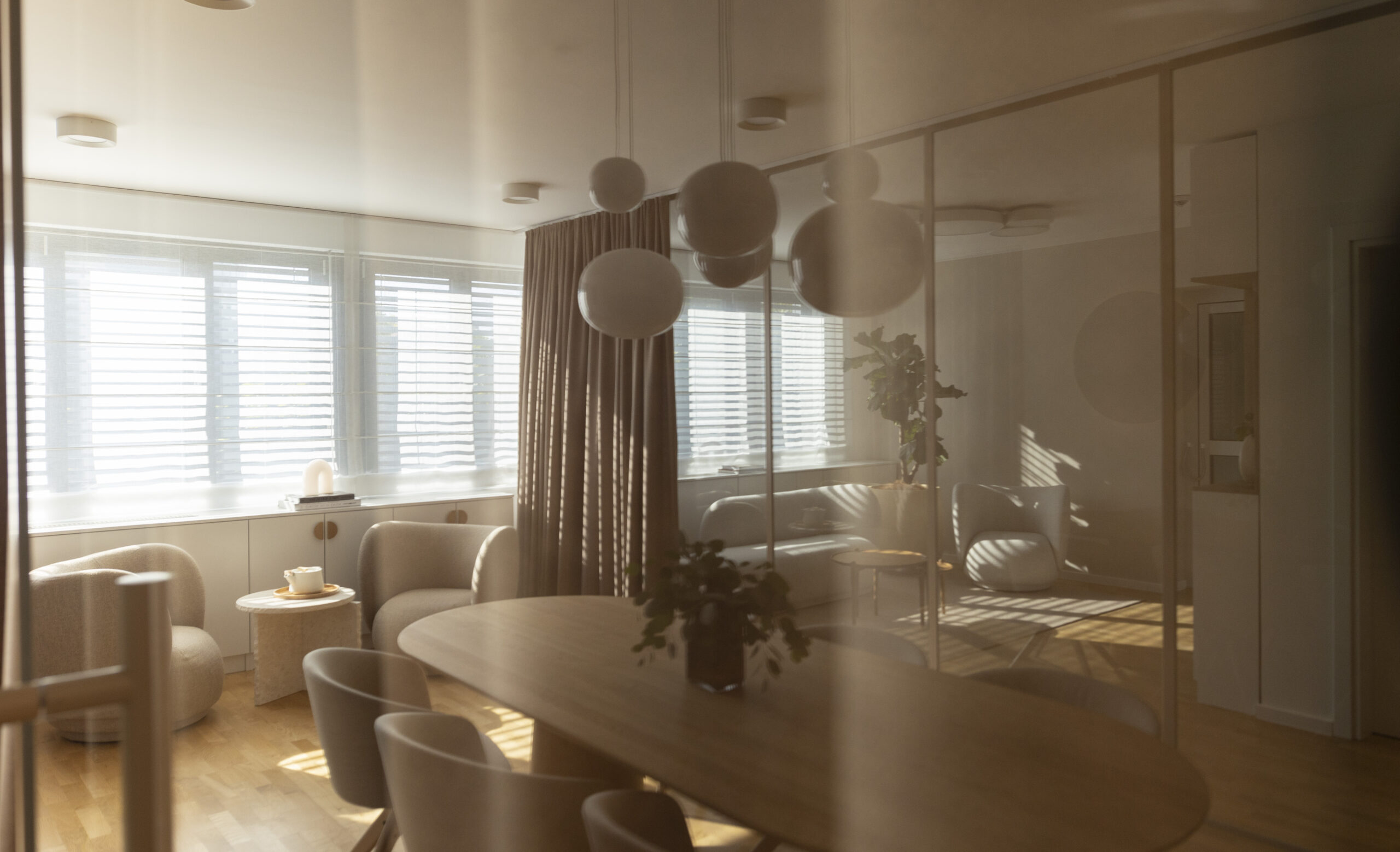 “Posebno smo dizajnirali srednje visoki community table od kamene ploče, koji služi kao centralno mjesto okupljanja i zajedničkog rada. Obodni ormari imaju dvostruku funkciju – služe kao spremište, ali i elegantno skrivaju fenkojlere, doprinoseći čistoj i prozračnoj estetici prostora. Dodali smo i zastore koji ne samo da vizualno oplemenjuju prostor, već poboljšavaju njegovu akustiku, stvarajući osjećaj topline i ugode.”- izjavila je arhitektica Andrea Bušić Vargić