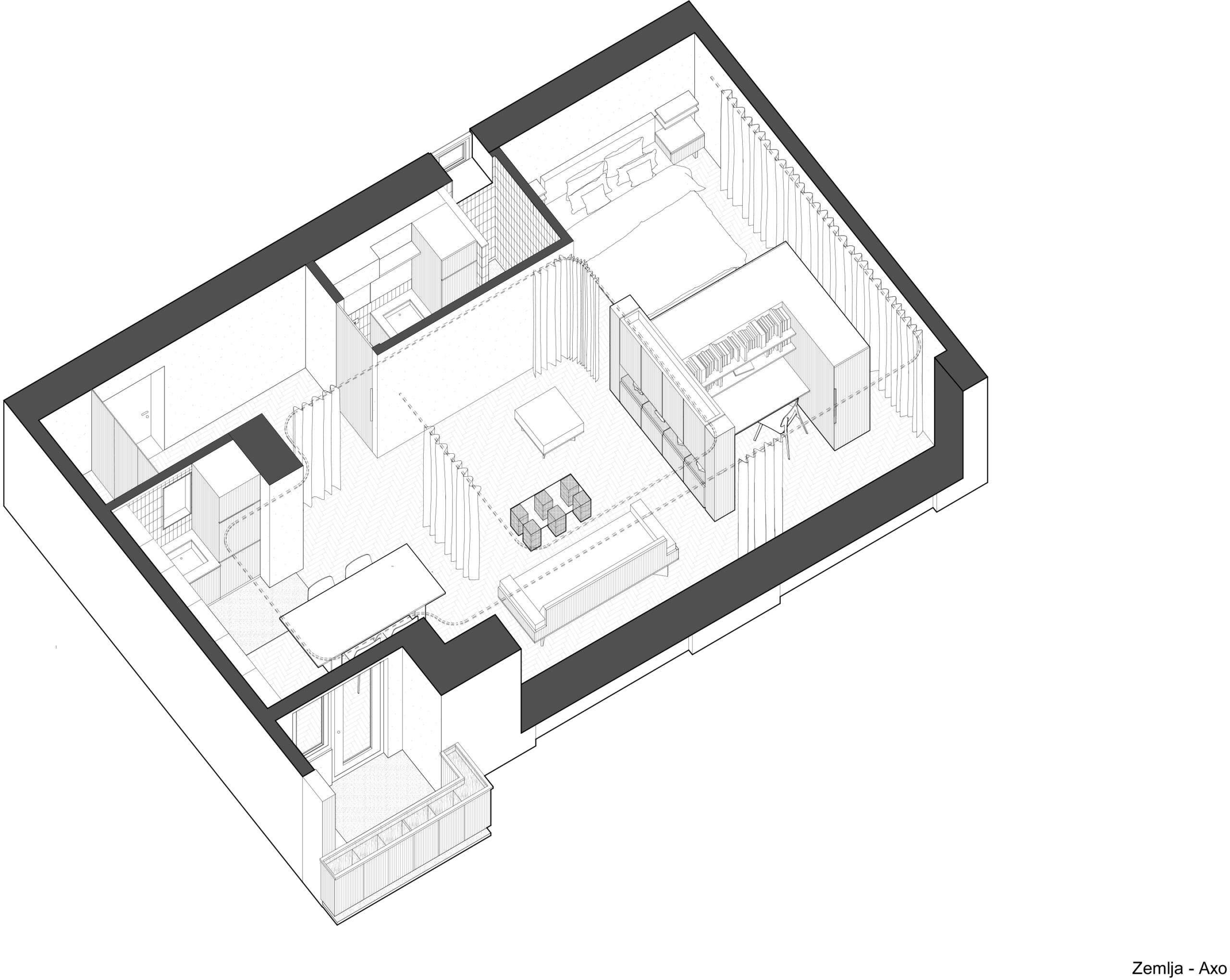 Originalni zapušteni stan radikalno je transformiran u prostran i adaptabilan dom, radeći u kompaktnoj površini od 50 m2, zamjenom nestrukturni pregradni zidova pokretnim zavjesama koje pretvaraju četiri mračne, male sobe u jedan velikodušan svijetli prostor s adaptabilnim prostorijama.