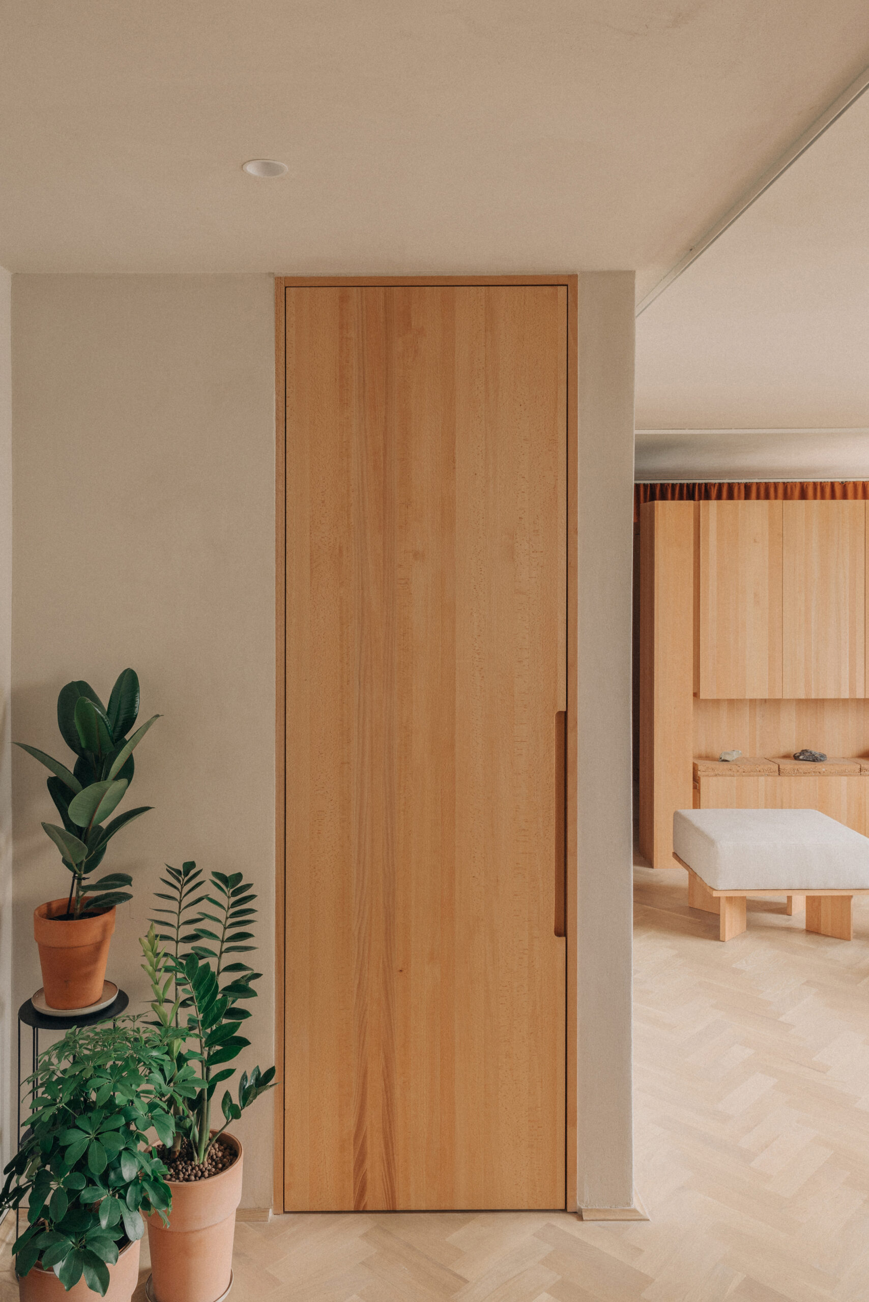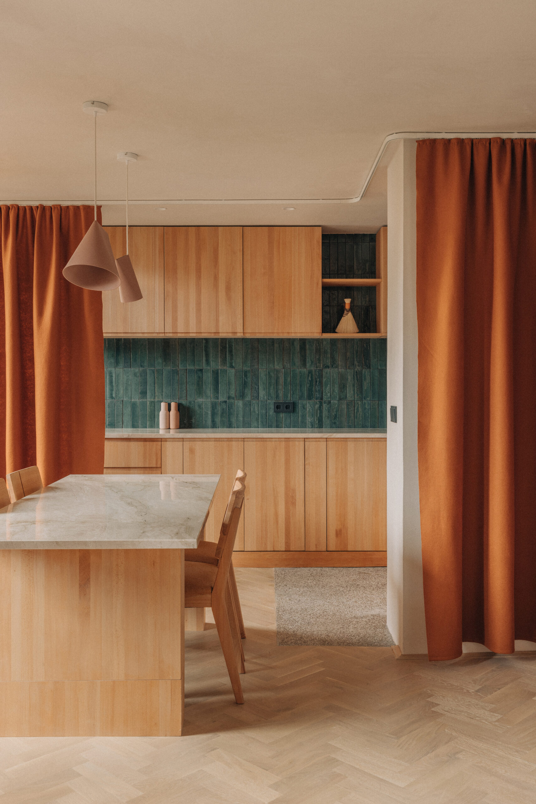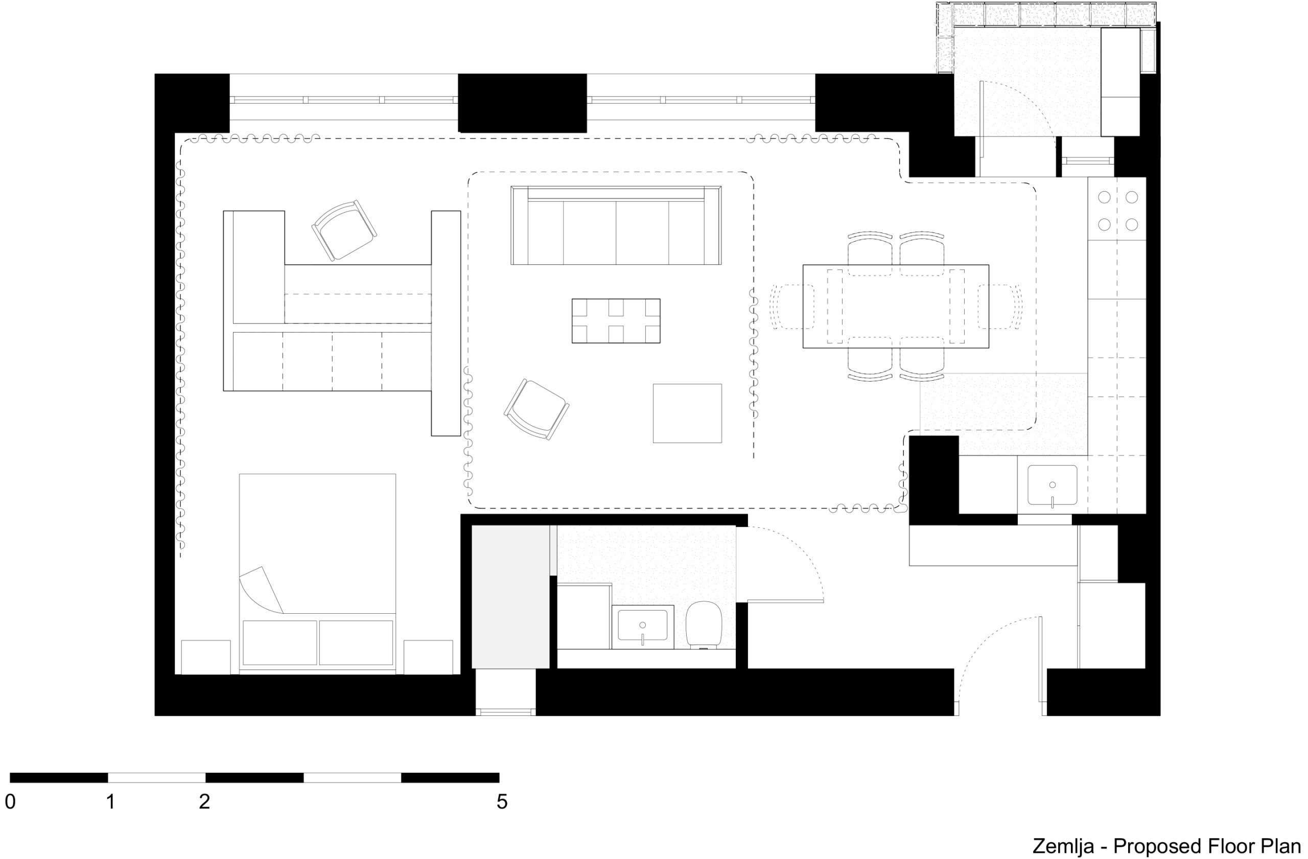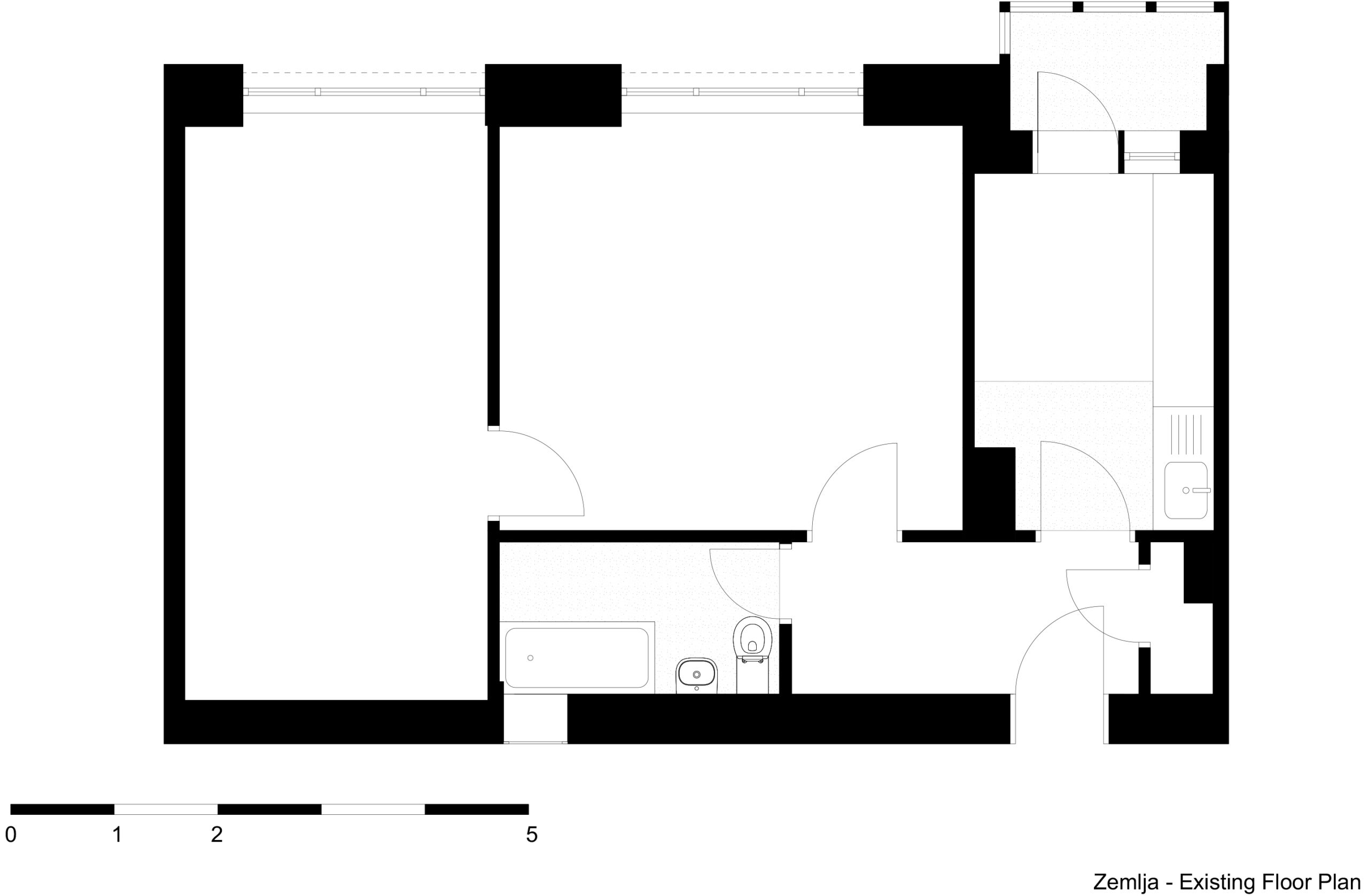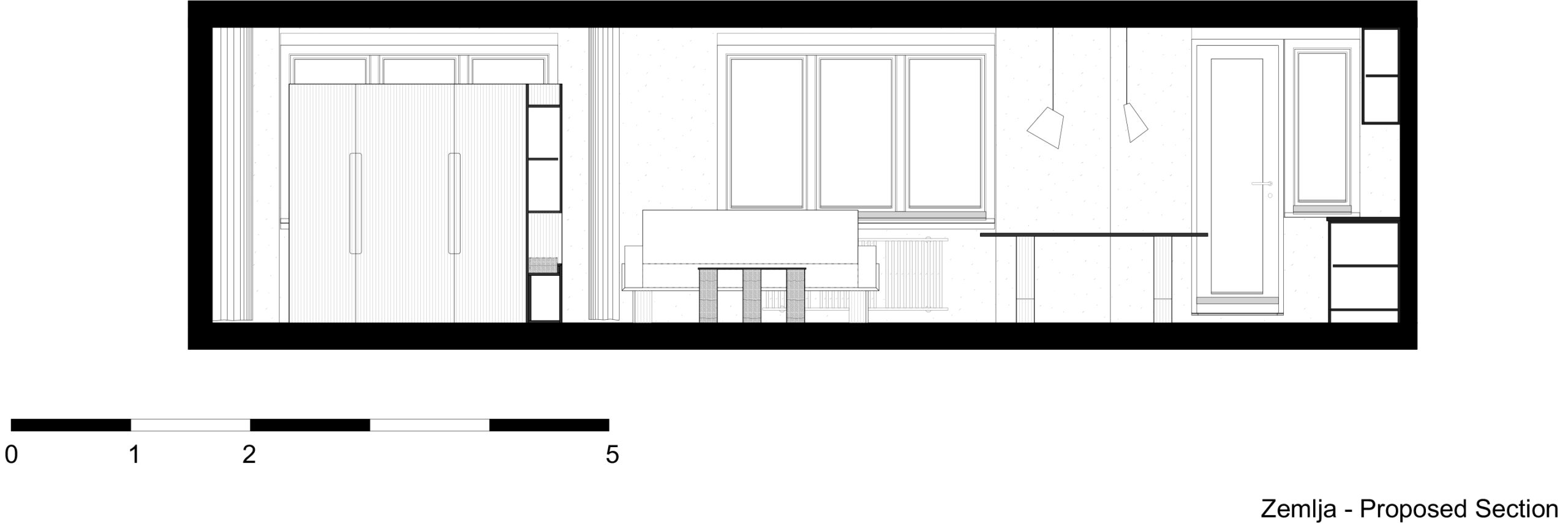 Podovi od bijelog uljanog hrasta u obliku riblje kosti ujedinjuju cijeli stan, a sačuvani su ostaci originalnog teraco poda u kuhinji i kupatilu koji obilježavaju njegovu prošlost. Uz to, ulazni hol je udobniji i bolje osvjetljen uklanjanjem zida i kreiranjem prozora prema kuhinji. Ista tri ostrva nameštaja, zajedno sa sečijom, krevetom i natkasnama, dizajnirali su po mjeri arhitektonski studio Projekt V Arhitektura kao novi asortiman nameštaja, koji se takođe naziva “Zemlja“.
