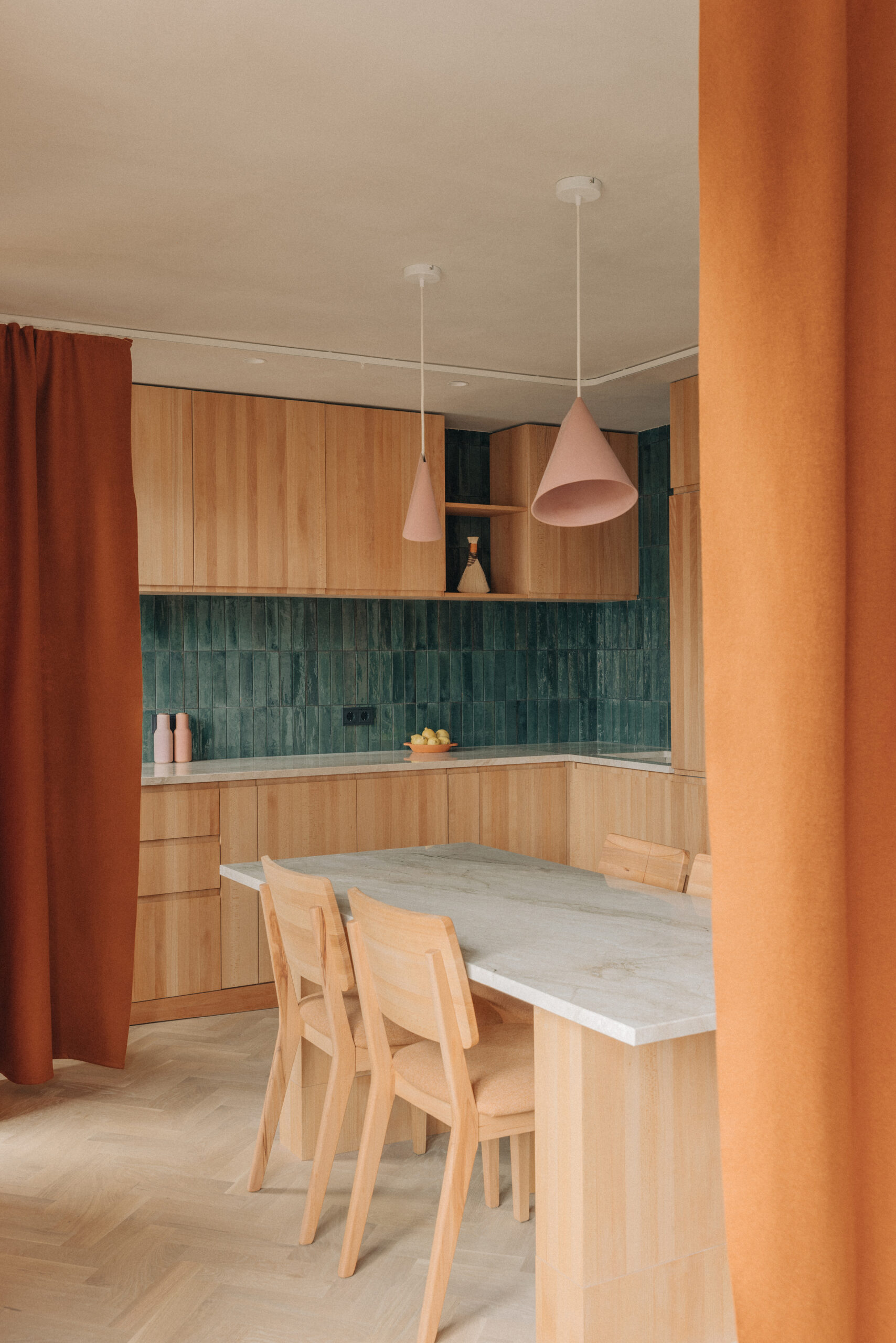 Upotreba domačih proizvoda od punog drveta; uključujući masivne ljepljene ploče od bukve, hrastov parket i prozore od jele smreke, koji su sve pristupačniji od uvoznih alternativa, ne samo da doprinosi cirkularnoj ekonomiji, već i simbolično povezuje stan sa šumama Bosne i Hercegovine, koje pokrivaju preko 50% zemlje.